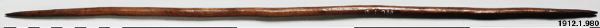 Smal, spetsig trästicka med två genomborrade hål i. Användningsområde okänt, men Kim Akerman föreslår att stickan använts i offentliga begravningsceremonier och inte klassas som ett hemligt-heligt föremål. Enl. Laurell är det ett dansattribut.