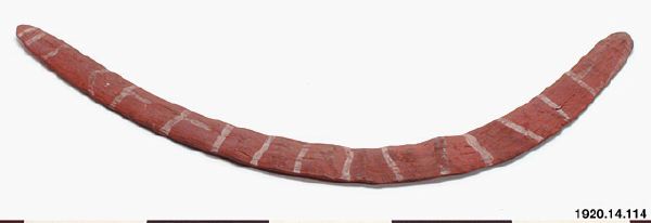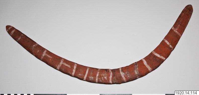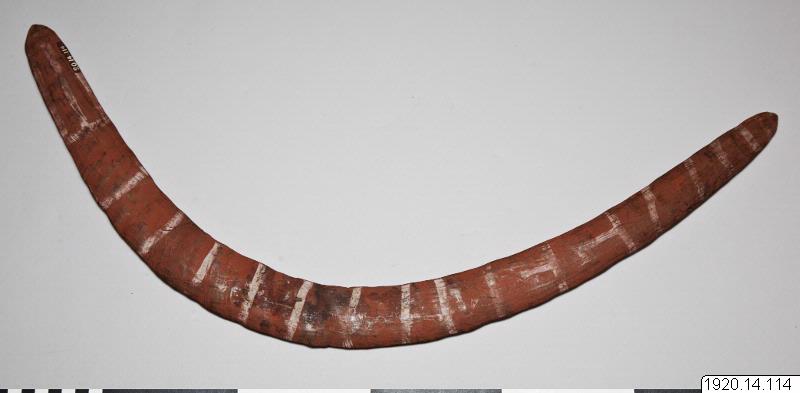 • Bumerang av hårt trä. Till formen ganska nära ett cirkelsegment. Målad röd med vita tvärllnjer. 61 x 23,5 cm. [ocr]
