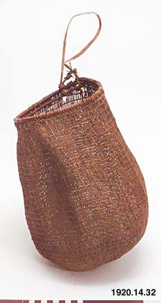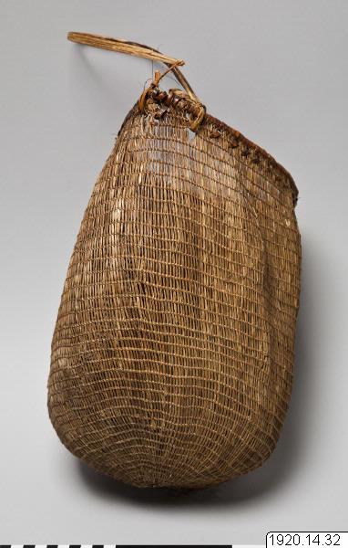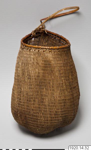 Korg av gräs, med rundbotten. Ytterkanten förstärkt med rottingvidja i spiral. Vid kanten kort bärband eller handtag. . Flätningen: vertikala grässtrån, vilka sammanlöpa i bottencentrum, samt ett dessa sammanhållande tvådelat, tvinnat ”snöre”, gående i spiral. Öppningen 23 x 17 cm. Höjd 30-36 cm. Handtaget (dubbelt ca 21 cm.) Queensland Australien