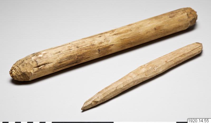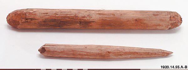 "Klanghölser", 2 stycken. En större och en mindre. Det större trästycket är avrundat i båda ändarna, det mindre starkt tillspetsat i den ena änden. Slås de mot varandra ger det större trästycket ett ganska starkt, metalliskt klingande ljud ifrån sig. Det större 40 cm långt. Diam 4 cm. Det mindre 28,5 cm långt. Största diam på 2,8 cm. Cedar Creek, Queensland, Australien.(generalkatalogen)