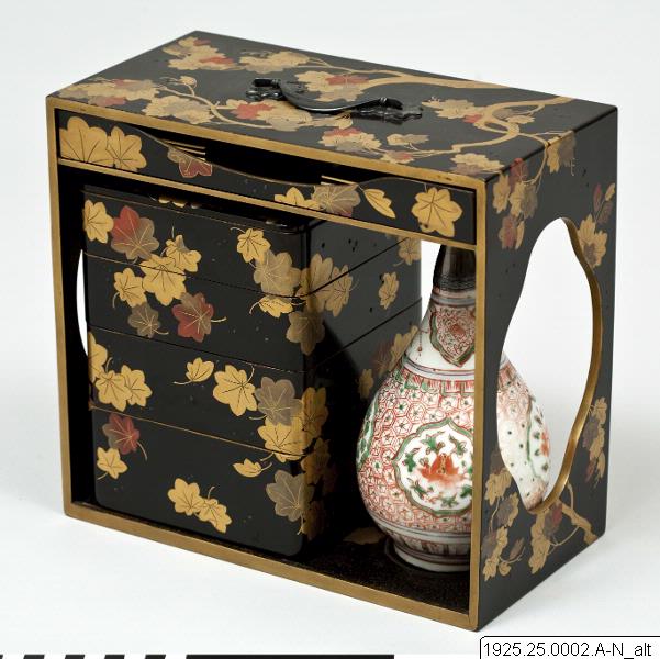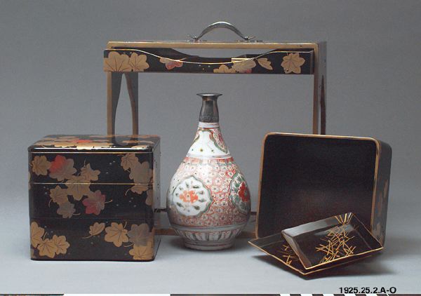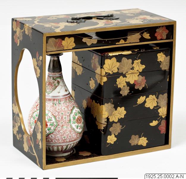 Matsäcksställ av lackerat (maki-e) trä, porslin och metall; ställning innehållande fyra över varandra ställda lådor, den översta med lock; bricka med fem småtallrikar och sake-skål samt sake-flaska med halsen silverbeslagen.