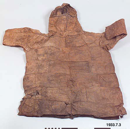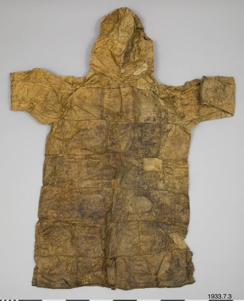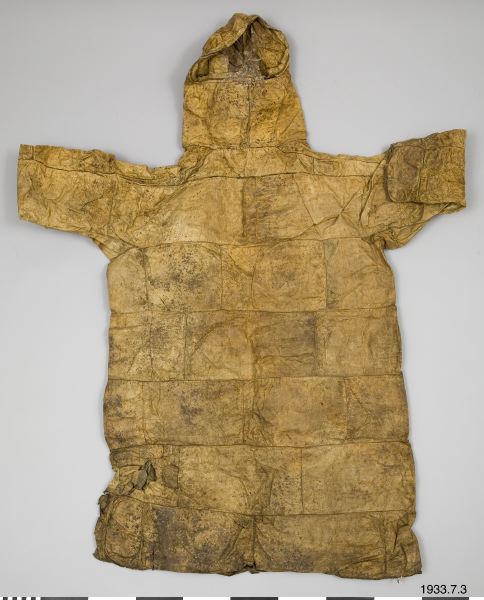 • Skjorta av fågelskinn (enl. katalog) ihopsydd av lagda rektanglar (ca 25 x 13 cm) med passpoaler i sömmarna, samt med kapuschong.