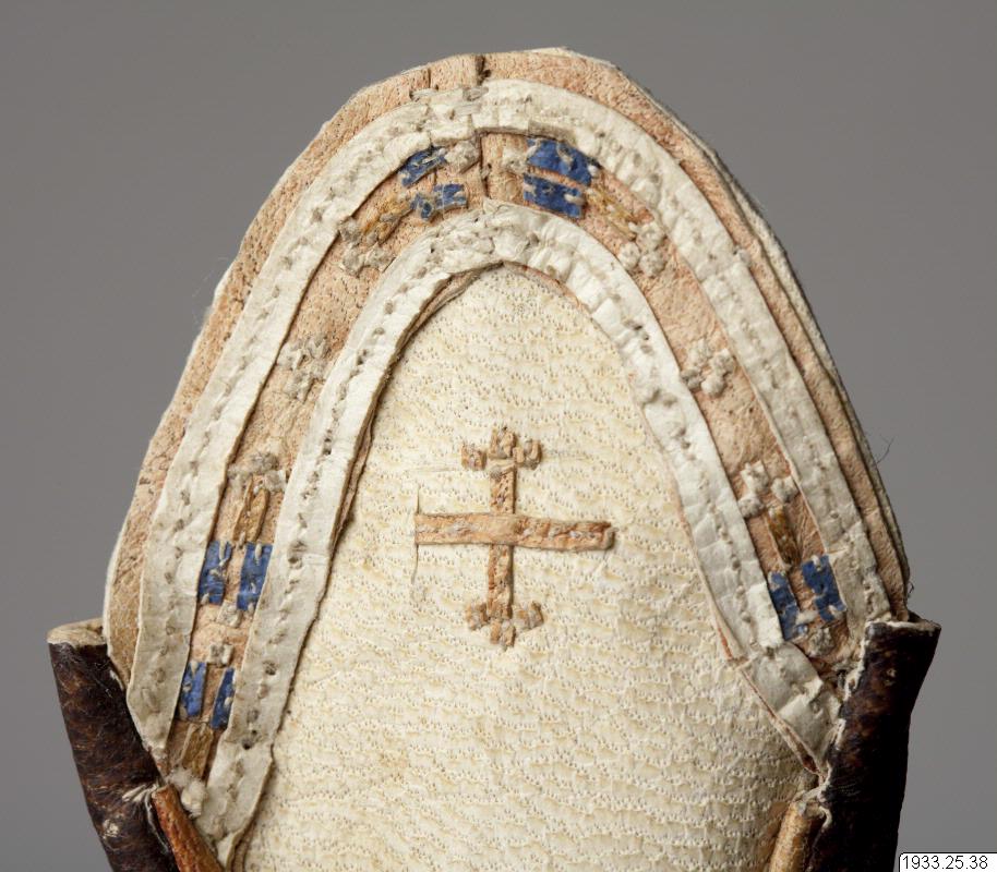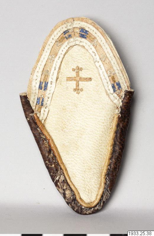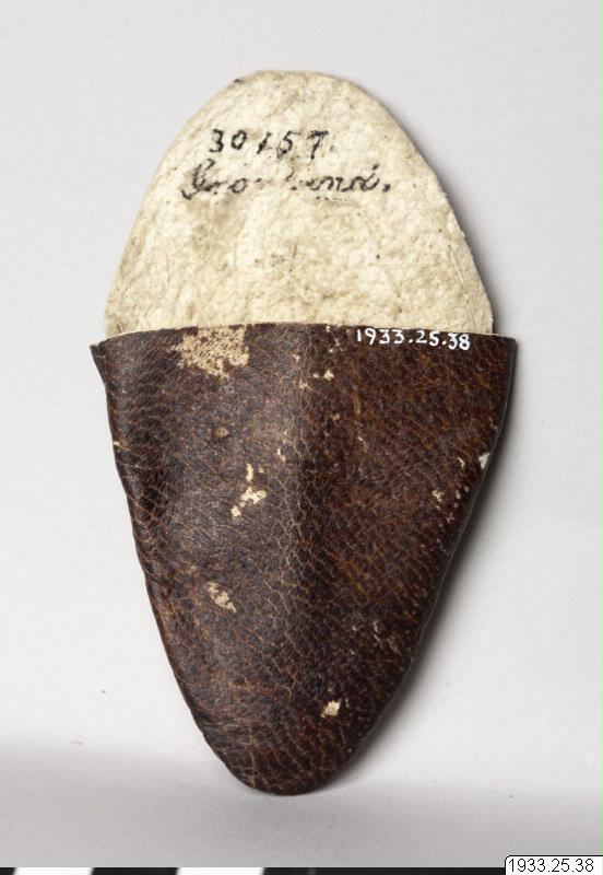 • Hölster för tummen, av läder. Broderat.