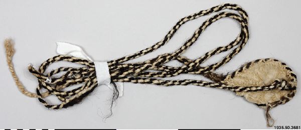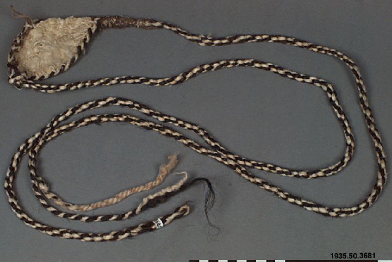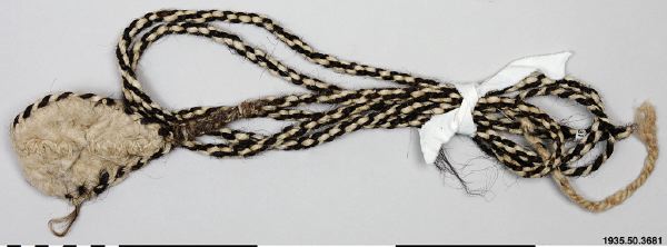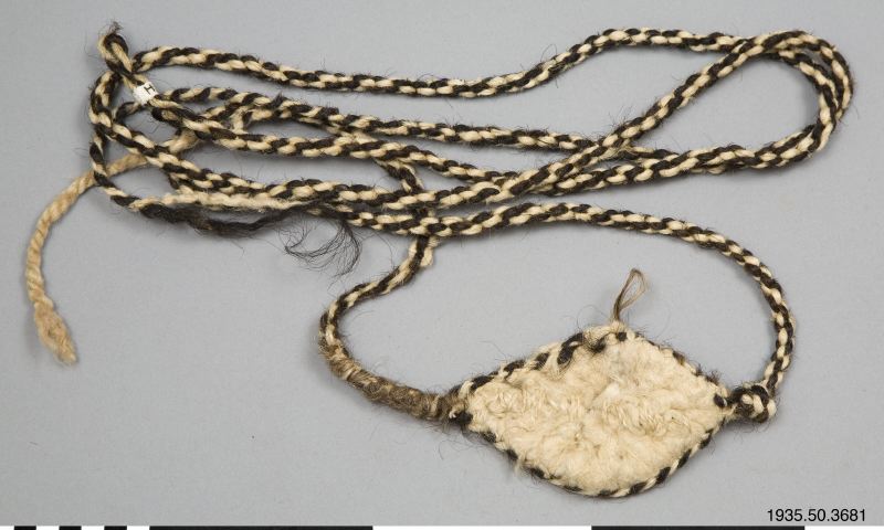 Rep av hår/ tagel. i vit och brun färg. Mitt på ett rep sitter en vit platta av löst filtad ull med stygn av garn i samma kvalité. Plattans längd är 15 cm, på det bredaste stället 9 cm. Två S-tvinnade delar bildar en Z-snodd.