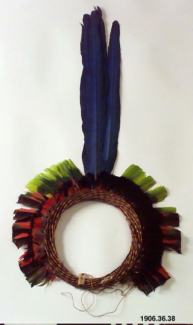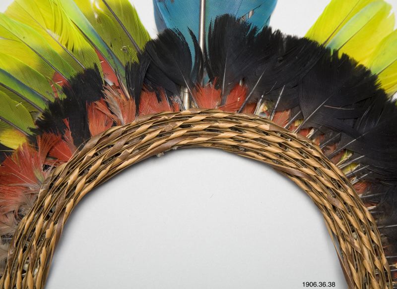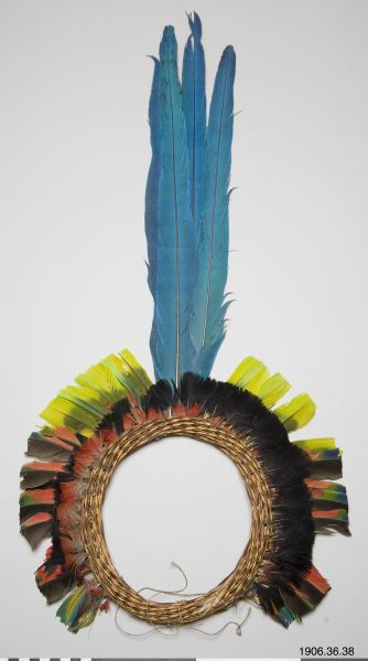 Fjäderkrona/diadem av fjäder i olika färger, i framkant tre st blå arafjädrar instuckna. Nummer: 35, 36, 37, 38 på samma föremål.