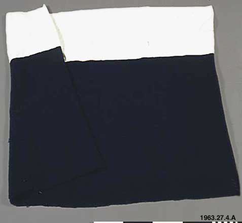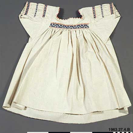 Kjol och blus (A-B) a. Kjol. Chincuete el balleta) av blå ylle med överdel påsydd av vitt bomullstyg. Kjolen färgad i anil-teknik av Da joaquina de Gordo, San Miguel Chiconcuac. Mexico. Vävd och sydd i Chiconcuao. Pris 100 ps. Kjolens längd: Tygets bredd 104 cm Tygets längd: Kjolens vidd: 270 cm Mexico. b. Blus av tjockt bomullstyg. sk "manta" broderad på bröstpartiet och runt ärmarna i sk "sobre-puesto" med blå merseriserad tråd samt runt halsrigningen med langettsömn i rött. Tillverkad av Catalina? Svägerska till föregående. (hör till föregående)
