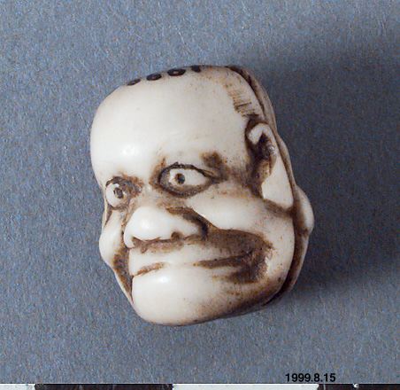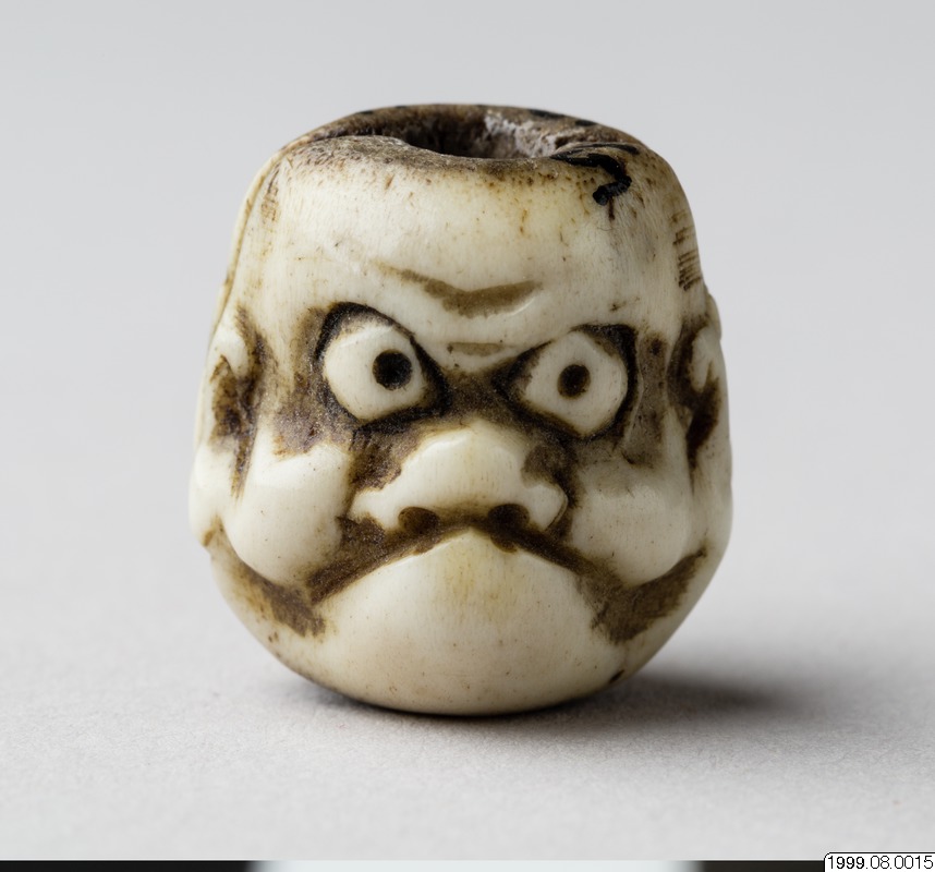 Ojime (löpkulan runt snörena mellan netsuke och inro), i form av två no- eller kyogen-masker med baksidorna vända mot varandra. Japan. Kimonon har inga fickor, småsaker kunde läggas i ärmarna och innanför bältet och så kunde man bära olika dosor, pipor och penselfodral på en snodd från bältet. De bärbara sakerna kallas sagemono. Accessoarerna blev särskilt för männen identitetsskapande statusföremål och en viktig del av herrmodet, en egen värld i mindre skala med rika motiv. Olika typer av konstnärligt utformade sagemono är kända fr o m 1600-talet. Förutom tobaksrelaterade dosor är en av de mer kända typerna sigilldosor (inro). Bokstavlig betydelse är en korg (ro) att lägga sigill (in) i. Enligt lag var endast stämplade signaturer giltiga vilket krävde att t ex samurajer och köpmän som hade behov av sigillstämplar fick bära dem med sig i små dosor. Detta var ursprunget till sigilldosor (inro) som snart främst kom att användas för medicinförvaring. Utseendet på accessoarerna varierade efter bärarens smak, ekonomi och modetrender. När västerländsk klädsel med fickor blev populär under Meiji-perioden (1868–1912) minskade behovet av dessa bärbara föremål och de delades ibland upp i sina beståndsdelar (netsuke, s k bältesknappar) för sig och såldes till västerlänningar. (Baserad på text från utställningskatalogen Japan. Föremål och bilder berättar. 2011). Miniatyrskulpturerna, ofta kallade bältesknappar, (netsuke) rymmer en hel värld att utforska. Myter är ett stort motiv. Ofta var designen lyckobringande och inte minst underhållande. Netsuke-föremålets funktion består i att vara en motvikt till de "hängande saker" (sagemono) som bars till kimonon av männen. Vanliga hängande saker var olika dosor, till exempel medicindosor (inro) och tobakspungar. Netsuke betyder ungefär "fästa rot" och tidiga netsuke (före sent 1600-tal) var förmodligen naturliga, obearbetade rötter och liknande. Från 1700-talet gjordes de mer föreställande och ofta i trä eller elfenben. Så småningom började konstnärerna att signera sina netsuke. (Baserad på text från utställningen Japan. Föremål och bilder berättar. 2011). /PH