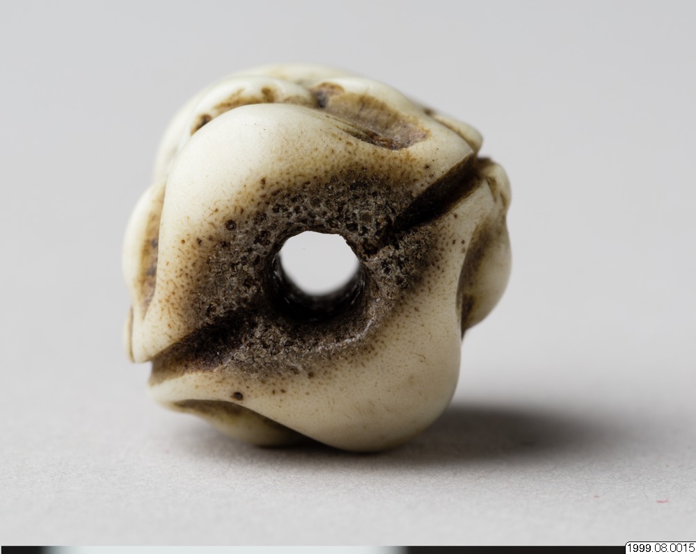 Ojime bead (cord fastener between the inro and netsuke) in the shape of two no- or kyogen masks. The kimono having no pockets, accessories have to be carried somehow. Women could put small objects in their sleeves and sash, whereas men, mainly, would hang their various boxes, pipes and brush cases on a cord at their belt. The portable objects are called sagemono. Accessories became identity-forming status objects and an important part of men´s fashion, a world in miniature with a wealth of subjects. Various kinds of artistically crafted sagemono are known from the 17th century. In addition to boxes for tobacco, cases for personal seals (inro) are one of the best-known types. Literally translated, an inro is a basket (ro) containing a seal (in). Only sealed signatures were legally valid, and so samurai and merchants, for example, needing seal stamps had to carry them in small cases. This was the origin of “seal baskets” (inro), which soon came to be used primarily for carrying medicine. These accessories varied in appearance according to the wearer’s taste and wealth, as well as fashion trends. When Western dress became popular during the Meiji period (1868-1912), there was less need for these portable objects, and they were divided up into their constituent parts (with toggles kept apart) and sold to westerners. (Based on the text for the exhibition catalogue Japan. Artefacts and images tell the story. 2011). The function of the netsuke item is to be a counterweight to the "hanging things" (sagemono) worn with the kimono by the men. Common hanging items were various boxes, for example medicine boxes (inro) and tobacco pouches. Netsuke roughly means "fixed root" and early netsuke (before the late 17th century) were probably natural, unprocessed roots and the like. From the 18th century they were made more representative and often in wood or ivory. Eventually, the artists began to sign their netsuke. (Based on the text for the exhibition Japan. Artefacts and images tell the story. 2011). /PH
