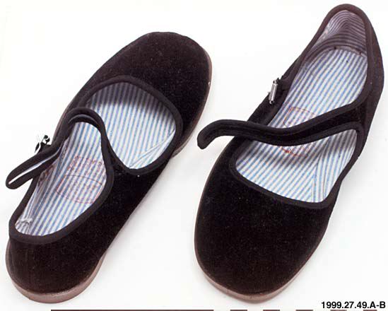 • Ett par skor. Barnskor? Utsidan svart sammet, insidan i vitt och blåt randigt mönster. Sulan gjuten i brun plast.