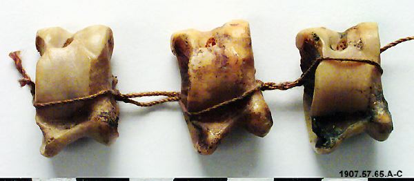 Tre astragaler sammanbundna med ett snöre. De är tagna från fårets astragal, hälbenet. I detta fall är de mycket små, vaför de troligen kommer från ett lamm. De anses vara föregångaren till den nutida sexsidiga tärningen. Astragalen faller med någon av de fyra sidorna uppåt när den kastas på ett underlag. Bruket av astragaler är känt från många kulturer. Astragaler har även användes för divination...