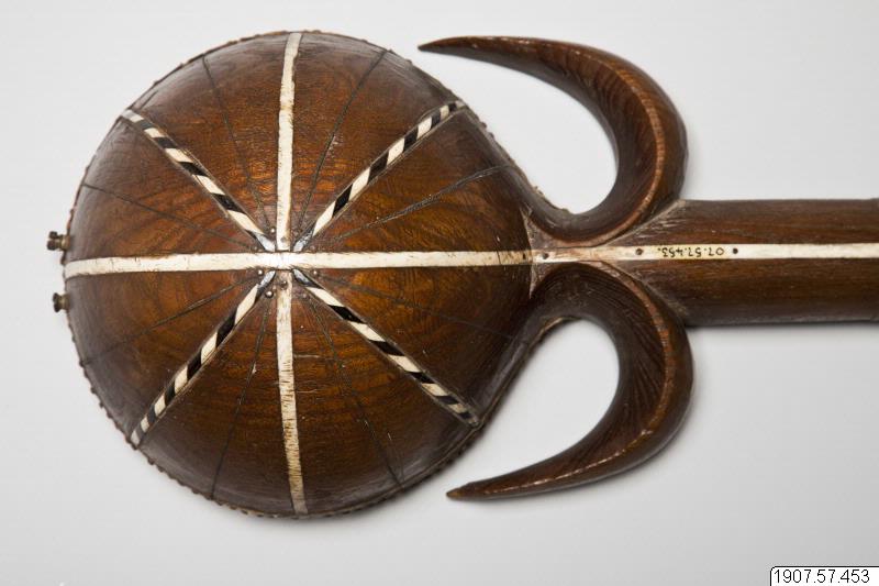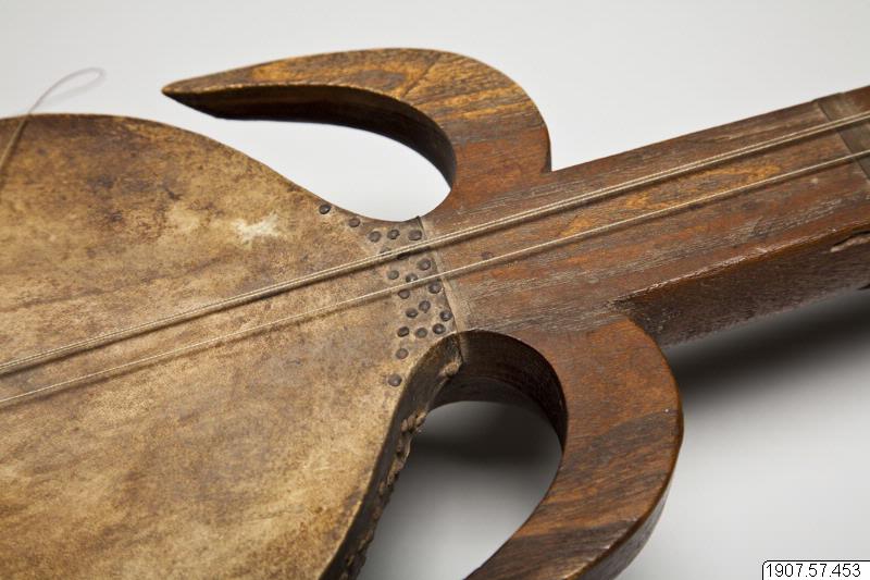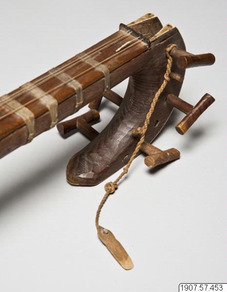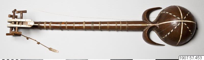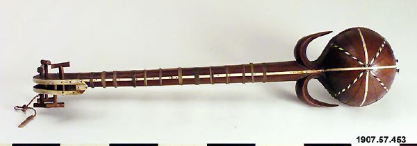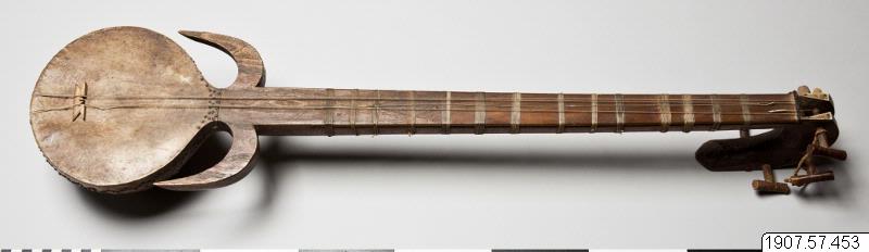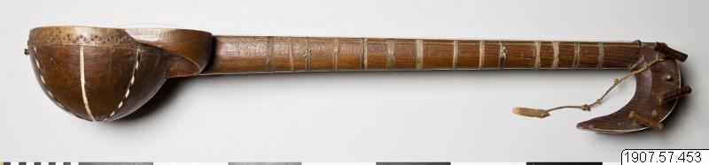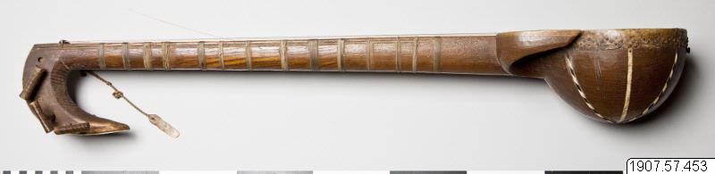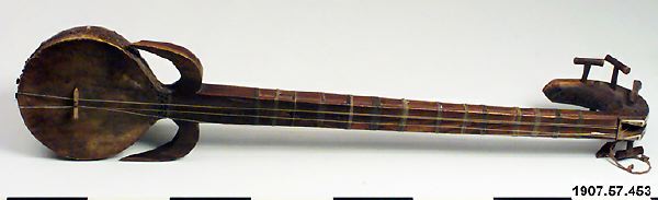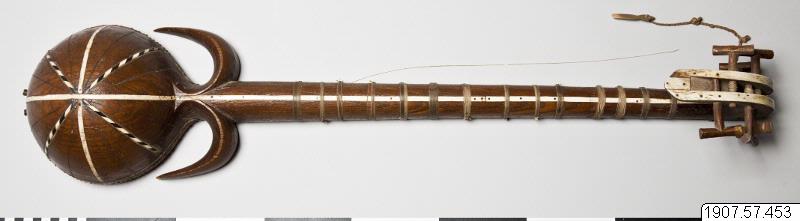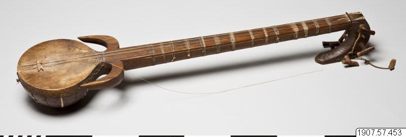 • Rewap, eller ravak, av trä (vanligen av mullbärsträ) med sex strängar. Ett skinn spänt över klanglådan. Dekorerat med ben och horn. Ett plektrum finns fästat vid halsen.