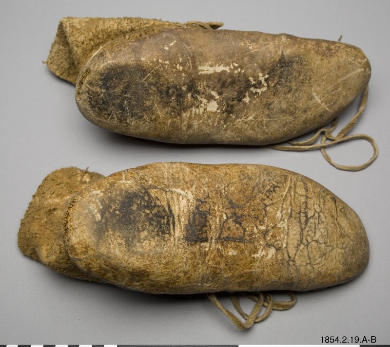 Ett par mockasiner med sulor av ogarvad bisonhud. Ordet mockasin kommer från algonkinspråkfamiljen. I stort sett alla indianer i Nordamerika norr om Mexico använde mockasiner, med undantag från området utmed gränsen till Mexico och Stilla Havskusten. Prärieindianerna hade vanligtvis en hård, kraftigare råhudssula med en mjukare behandlad överdel av "buckskin". Mockasinerna dekorerades med quillarbete, "pärlor", tyg, knappar och päls. Dekorationen skilde sig åt mellan olika folk. Kvinnorna gjorde mockasinerna och män som var ute på en längre färd eller jakt hade flera par med sig./SB, ASH För vidare information om mockasiner, se Colin F. Taylor, sid 61, samt speciellt om lokala skillnader i utformning, se Ronald P. Koch, kap 13.