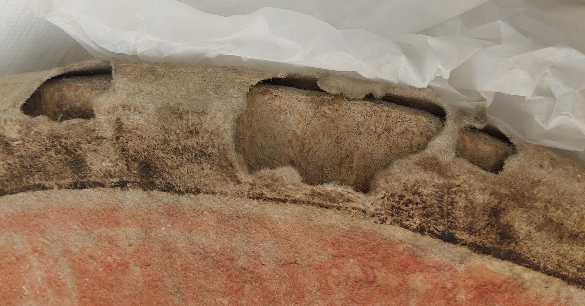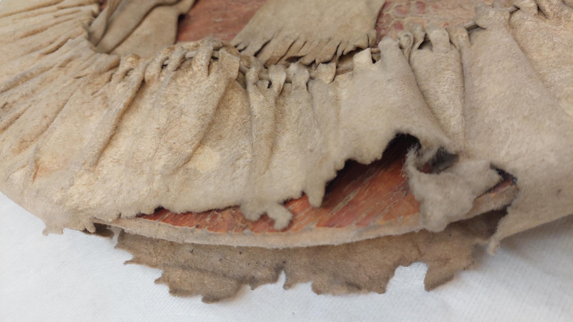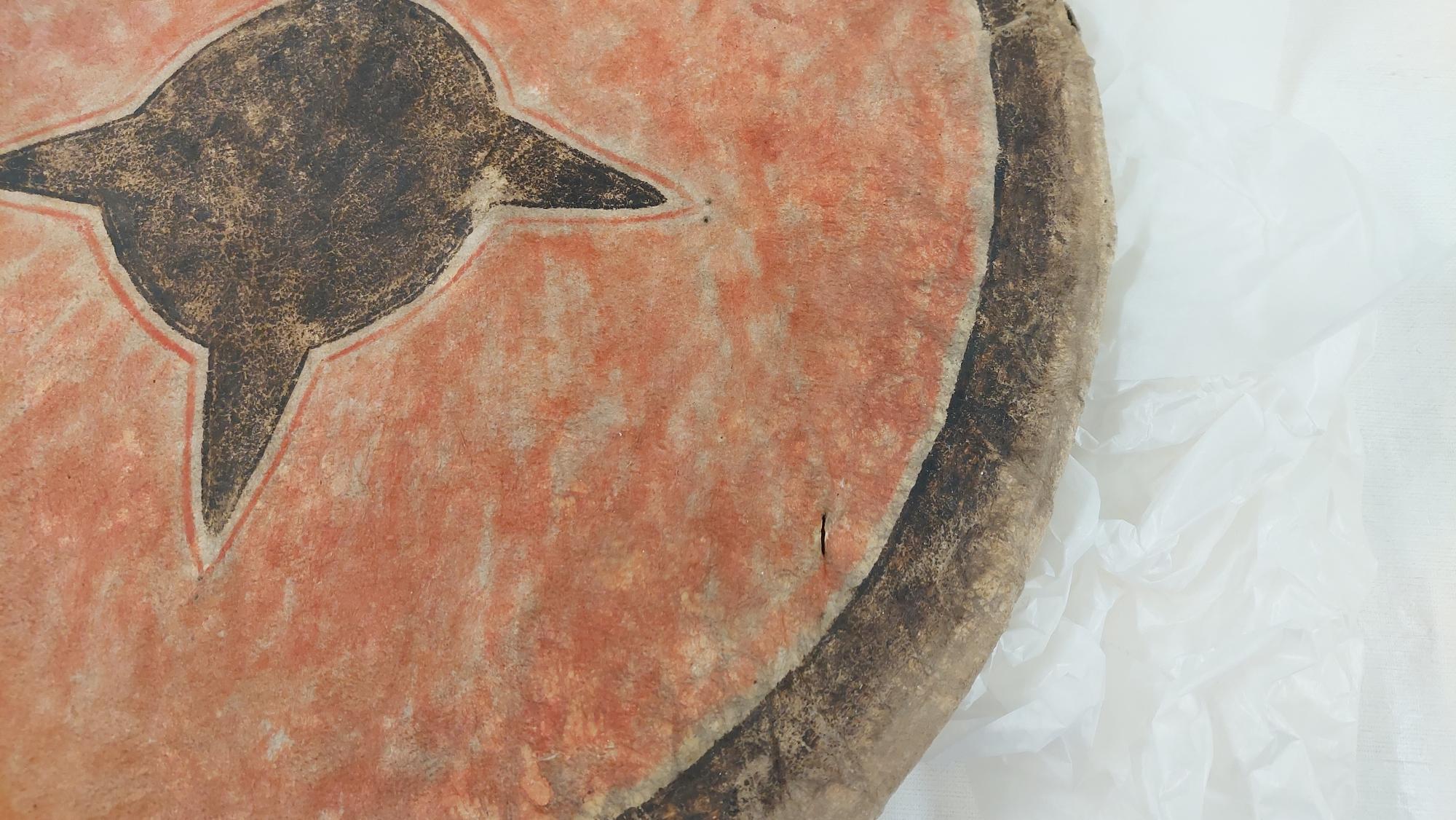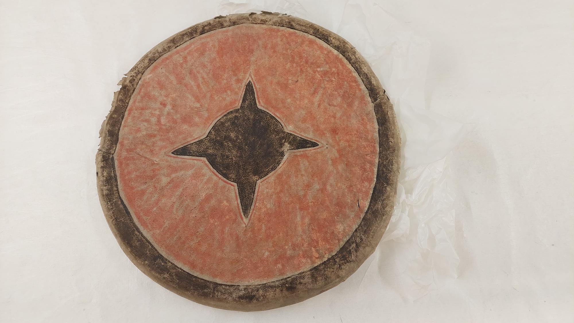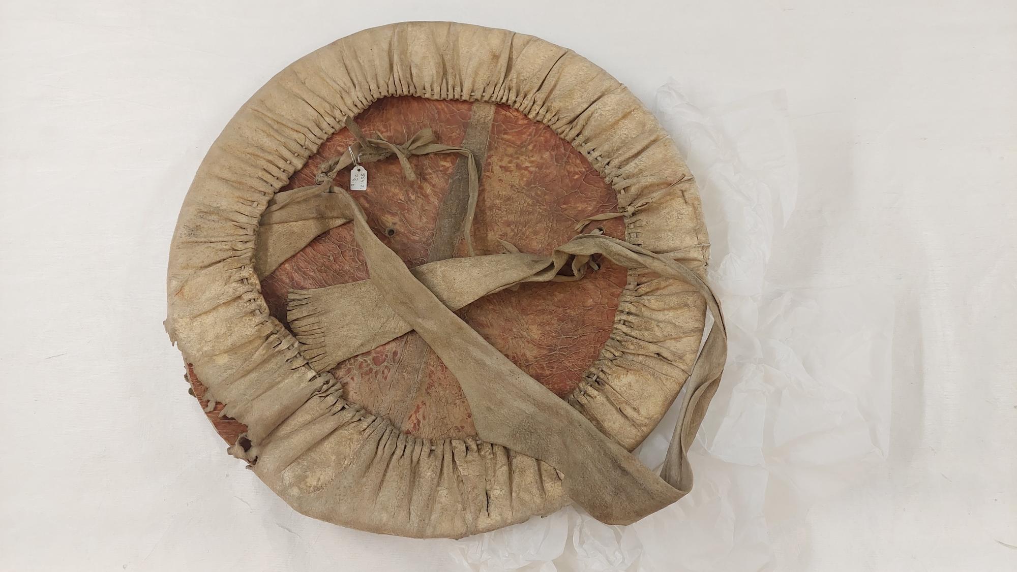 Shield Made from hard shrunken buffalo hide. The outer cover is soft leather. The pattern can have to do with a vision or solar eclipse. From the Plains or a neighboring area. (Exhibition, Indians of North America 2008)