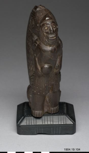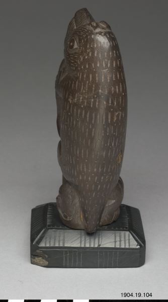 Skulptur, haida. Denna figurgrupp har motivet av en schaman som står med rund schamanskallra i ena handen och något avlångt föremål i den andra och septumperforerat med en näspinne, ett typiskt kännetecken för haidaschamanen. bakom schamanfiguren, som också har en typisk haida schamanhatt, står en bjön som biter schamanfiguren i nacken. Björnen sitter på en ihopkrupen mänsklig figur som har huvudet upp och ned under björnen. Denna grupp ä utförd i typisk agrillitskulpturfigurstil, men förefaler vara gjord av ett annat material, brun sten. Det kan emellertid vara en färgvariation av svart agrillit. Detta förekommer t.ex. i grönaktigt.