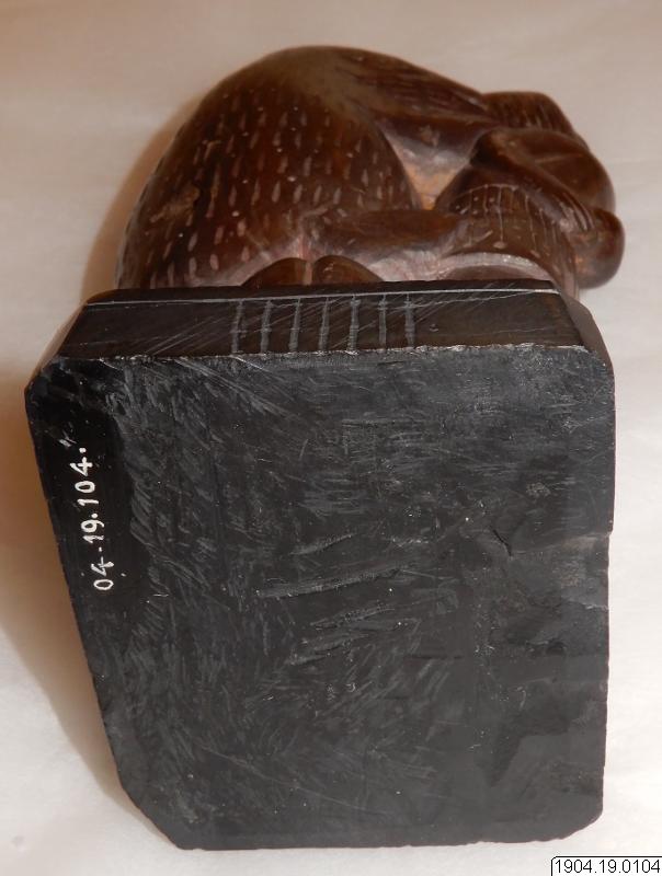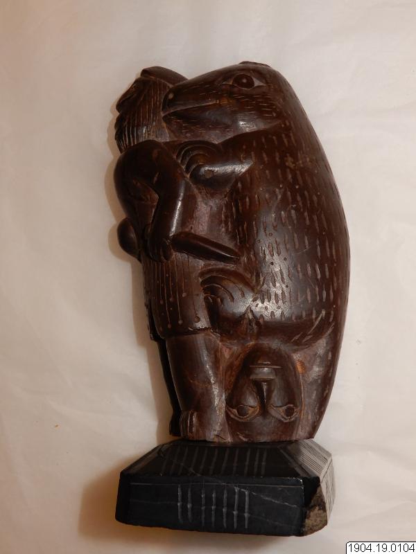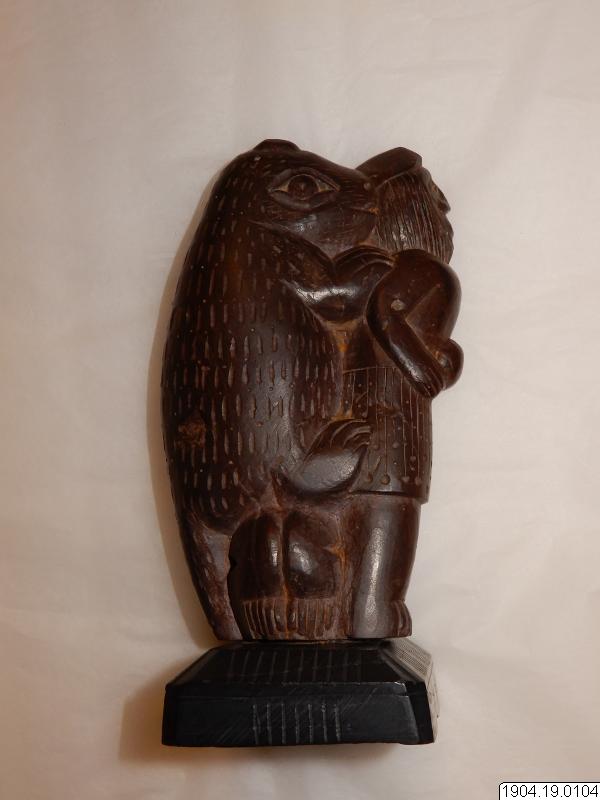 Enligt generalkatalogen är detta en grupp av brun sten: björn bitande stående manlig figur i nacken, björnen sitter på en hopkrupen mänsklig figur. Proveniensen är British Columbia. Gruppen är definitivt från haida och tillverkad under 1800-talet./JG