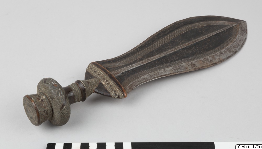 Dolk med bred klinga och dekorinläggningar i träskaftet. Dolken är obrukbar och bärs endast av vuxna män som en del av klädnaden/ dräkten. "Dolk från Baluba. Kasai. Tillhör A.J. (missionär Jacobsson)".(generalkatalogen) Dolken är identisk med den nedan beskrivna dolken från kuba (bakuba) som även de kommer från Kasai-området./HTB "The many versions of the type of ceremonial dagger that was carrie...