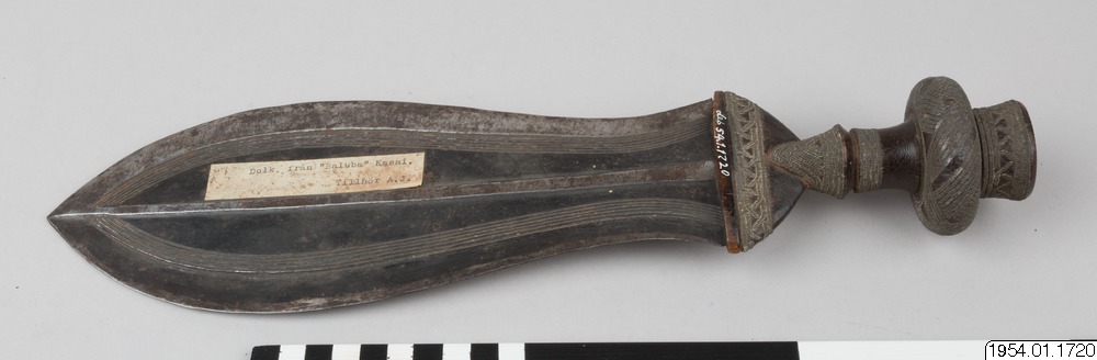 Dolk med bred klinga och dekorinläggningar i träskaftet. Dolken är obrukbar och bärs endast av vuxna män som en del av klädnaden/ dräkten. "Dolk från Baluba. Kasai. Tillhör A.J. (missionär Jacobsson)".(generalkatalogen) Dolken är identisk med den nedan beskrivna dolken från kuba (bakuba) som även de kommer från Kasai-området./HTB "The many versions of the type of ceremonial dagger that was carried by the Kuba all share the same general outline in which the pear-shaped blade and the handle with its standard combination of disk-shaped and cylindrical elements are regular features /.../ Serving no practical purpose whatsoever, these daggers were carried by the Kuba adult male as part of his costume."(African Metal Implements..., s.39)