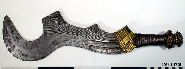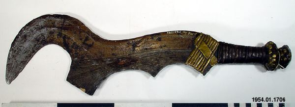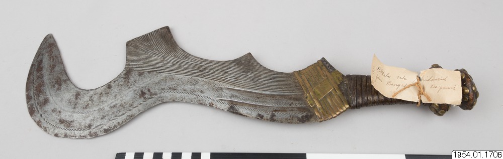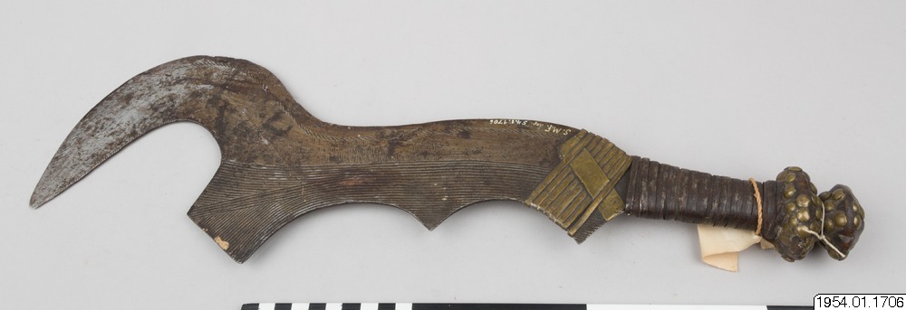 Svärd med streckornamenterad järnklinga där den övre delen är formad som en skära. Skaftet är av trä förstärkt med järn- och mässingsband. Typen av svärd har använts för avrättning av slavar och krigsfångar under förkolonial tid, senare användes de för slakt av djuroffer./HTB Texten i generalkatalogen - "Bödels- och stridssvärd från Bangala och Bayansi", stämmer inte med den information som ges om samma typ av svärd i "African Metal Implements..." s. 29 - "Often falsely labeled as Bangala knives, these types of execution sword have actually been made by the Ngombe... These swords were not used to execute a sentence of capital punishment by decapitation, as has sometimes been suggested".