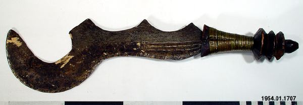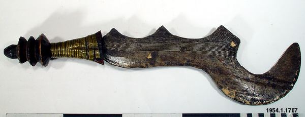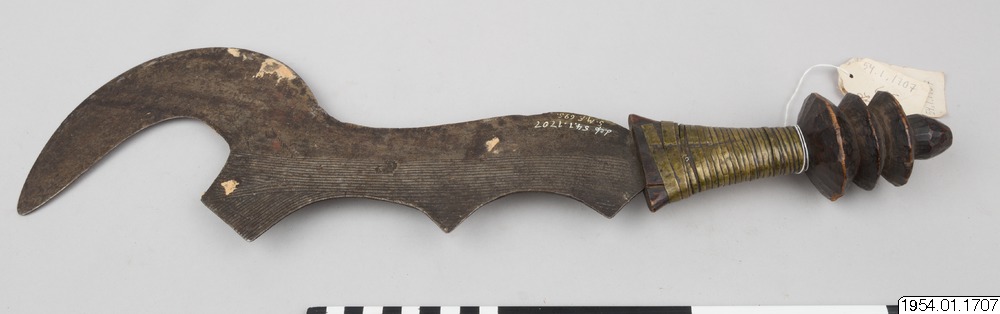 Svärd med streckornamenterad järnklinga där den övre delen är formad som en skära. Skaftet är av trä förstärkt med mässingsband. Typen av svärd har använts för avrättning av slavar och krigsfångar under förkolonial tid, senare användes de för slakt av djuroffer./HTB Texten i generalkatalogen - "Bödels- och stridssvärd från Bangala och Bayansi", stämmer inte med den information som ges om samma typ av svärd i "African Metal Implements..." s. 29 - "Often falsely labeled as Bangala knives, these types of execution sword have actually been made by the Ngombe... These swords were not used to execute a sentence of capital punishment by decapitation, as has sometimes been suggested".