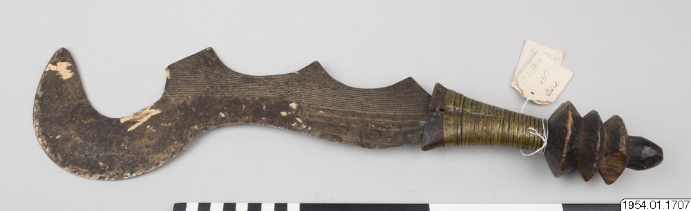 Svärd med streckornamenterad järnklinga där den övre delen är formad som en skära. Skaftet är av trä förstärkt med mässingsband. Typen av svärd har använts för avrättning av slavar och krigsfångar under förkolonial tid, senare användes de för slakt av djuroffer./HTB Texten i generalkatalogen - "Bödels- och stridssvärd från Bangala och Bayansi", stämmer inte med den information som ges om samma ty...