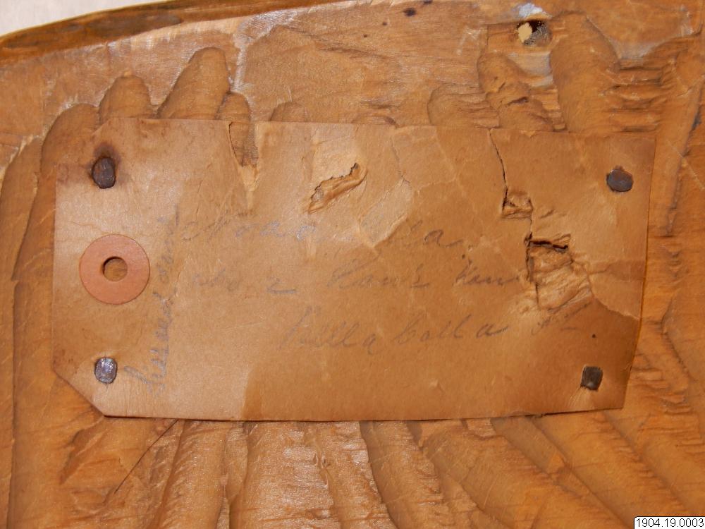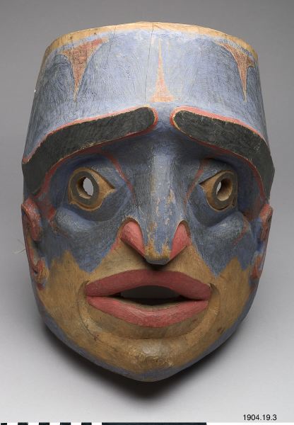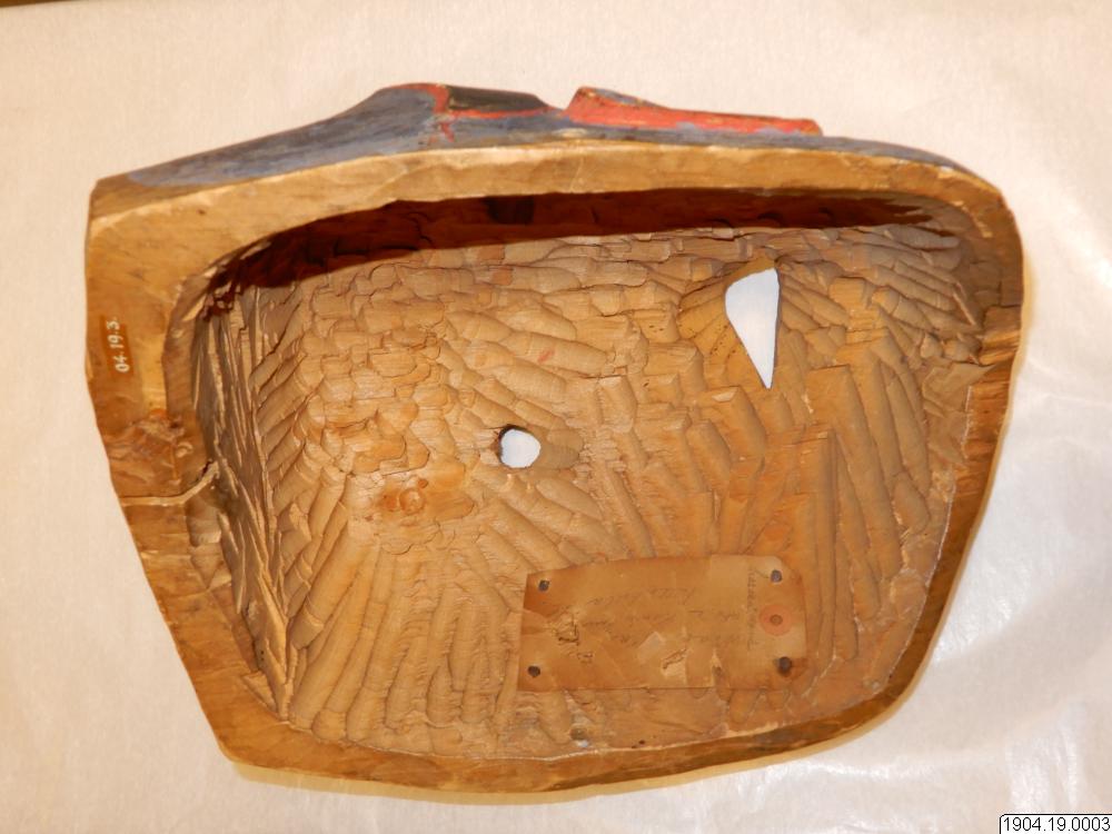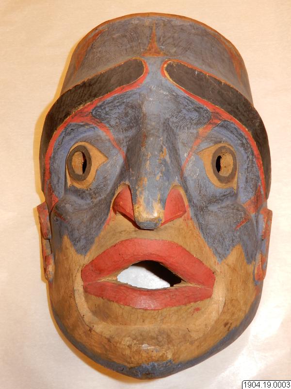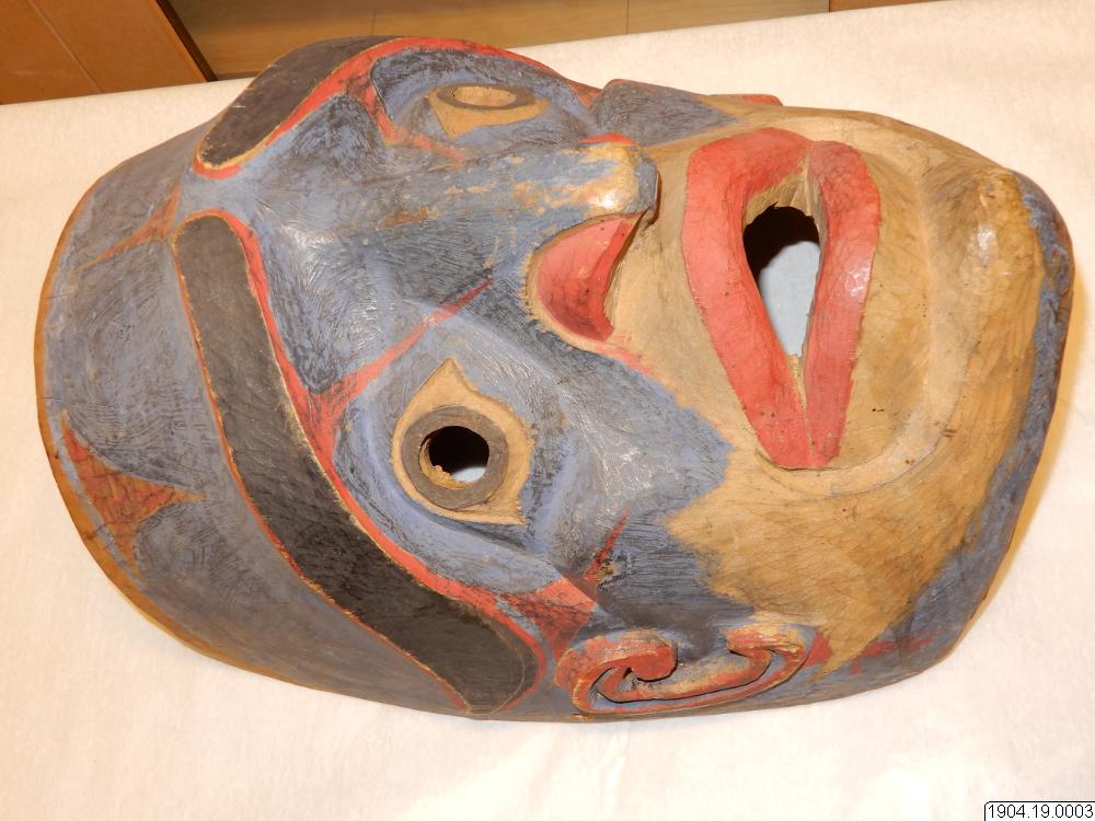 Enligt generalkatalogen är detta en mask. Noa killa haur kair (?). Sissauch-dansen. Med proveniensen British Columbia, bella coola. Med stor säkerhet stämmer här både proveniens och användningsområde. Masken ingår bland de föremål som kan ha samlats in av Fillip Jacobsen. Därför är generalkatalogens uppgifter med stor sannolikhet riktiga. Bella coola har två främsta hemliga sällskap. Sisaok är ett av dessa. I detta återuppspelas mytologiska sekvenser av de maskerade dansarna. Sisaok-sällskapets aktiviteter rörde och rör sig främst om hövdingskap, och den mytologiska sanktionen för deras status. Sisaok-dansen utförs dels när nya medlemmar initieras i sällskapet, då utförs ett stort evenemang. Ibland kan en sisaok-dansare uppträda vid mindre viktiga sammankomster. Varje enskild dansare framför sången och dansen som hör till masken. Detta anses som ett stort privilegium. Vid begravningar och potlatchfester uppträder ibland sisaok-dansare. Privilegier som tillhör varje mask berättas av dansaren. Den dansande visar på detta sätt karaktären och värdet av sitt medlemskap i sisaok-sällskapet. Det namn dansaren har i sällskapet berättas också. Dess namn har mytologisk grund och varje sisaok-framträdande bekräftar och förstärker åter igen de starka banden mellan mytologin och sisaok-sällskapet. Denna mask har alltså med stor säkerhet en gång tillhört en sisaok-medlem och är en mask ur det galleri med mytologiska gestalter som utgjorde dess grund. Med tanke på omständigheterna för insamlandet av denna mask är antagligen generalkatalogens benämning på denna mask riktig. För mer information, se dokumentationen av 1904.19.2. Masken är i fint skick./JG