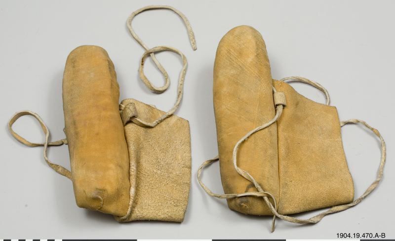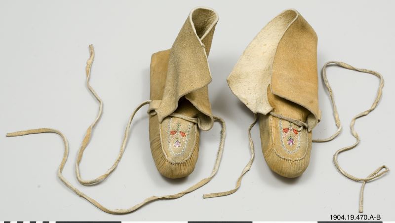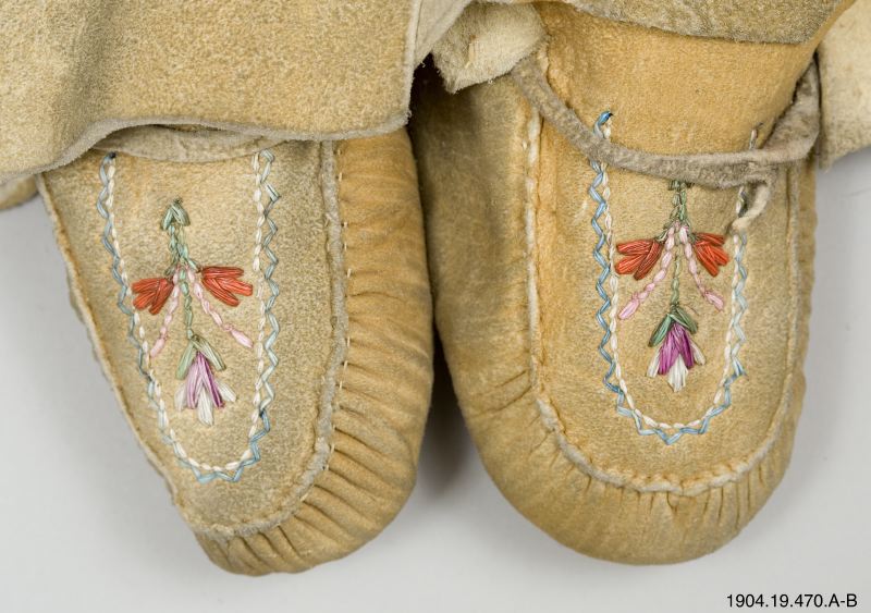 • Mockasiner ett par, gulbruna, med broderier av färgade erethizontaggar. Nyttjas i kanoter vid fiske etc.