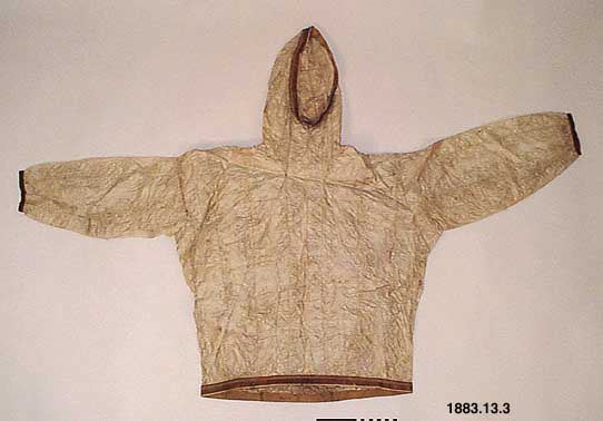 Manströja typ anorak av tarmskinn med kapuschong. Kapuschongöppning, nederkant och ärmöppningar kantade med brunt skinn. Vid kapuschong och nederkant även smala vita skinnremsor nersydda i vågformer på det bruna skinnet, samt smal vit skinnremsa ytterst.