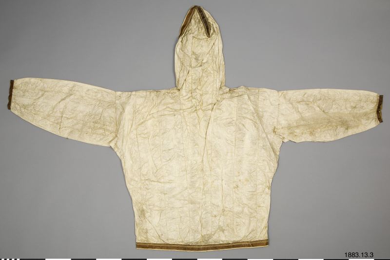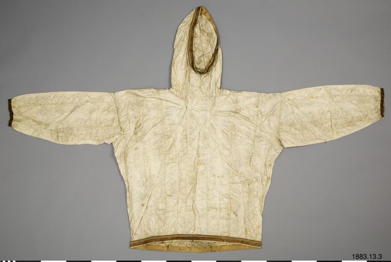 Gore-Tex, Grönland, 1800-tal. Den här anoraken är tillverkad av sältarmar och är vatten- och vindtät. Materialet har studerats och ligger till grund för Gore-Tex-materialet som är känt för sina egenskaper att andas och släppa ut fukt utan att släppa in varken väta eller vind. (Facebook, 2022-04-07)