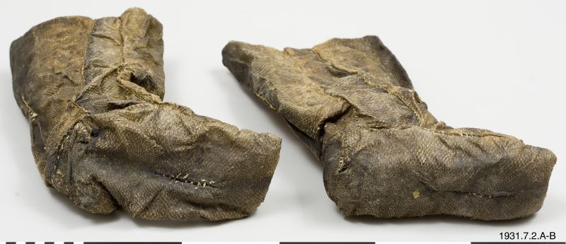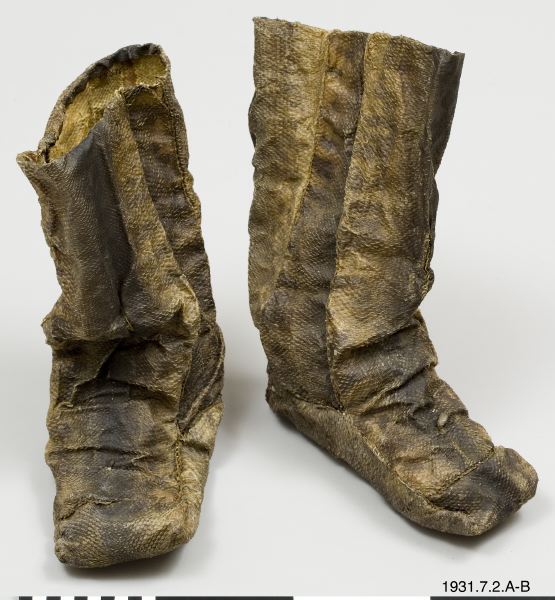 De äro förfärdigade av hopsydda laxskinn. Dylika stövlar användas i synnerhet av jägare och fiskare. Alnus begagna somninnerekern fYilning av gräs under det att japanerna för detta ändamål använda ett slags av bomull förfärdigade sockor — typiskt för ett söderifrånn inflyttat folk Stövlarna äro hopskrumpna, men enligt uppgift av givaren kunna de, efter att hava uppblötts 0 äter formas.