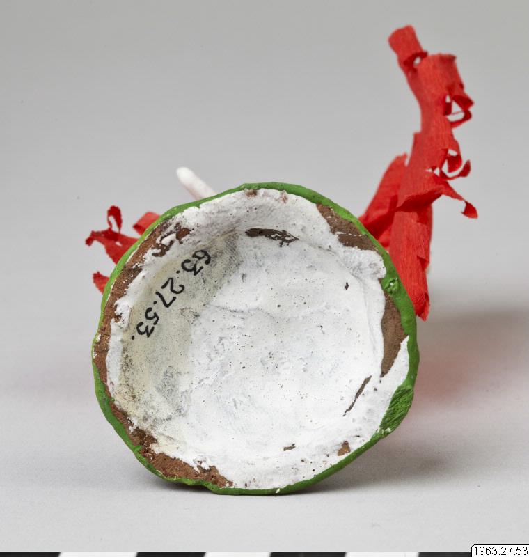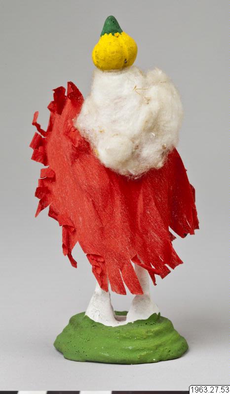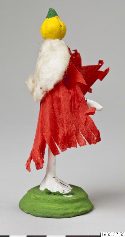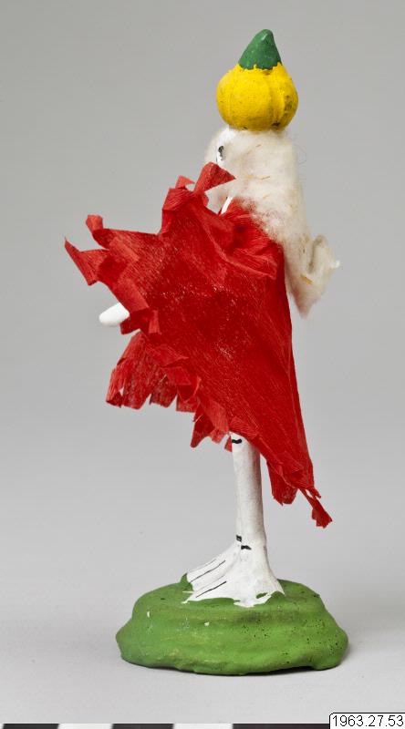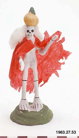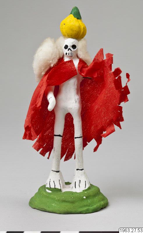 Stående skelett, "Calavera" av gips med kalebass på huvudet, hår av bomull och iförd mantel av rött kräpppapper, gestikulerande. Inköpt 1963 i Viktor´s butik för mexikansk folkkonst i Mexico City. Höjd ca 13 cm. Mexico. (generalkatalogen).