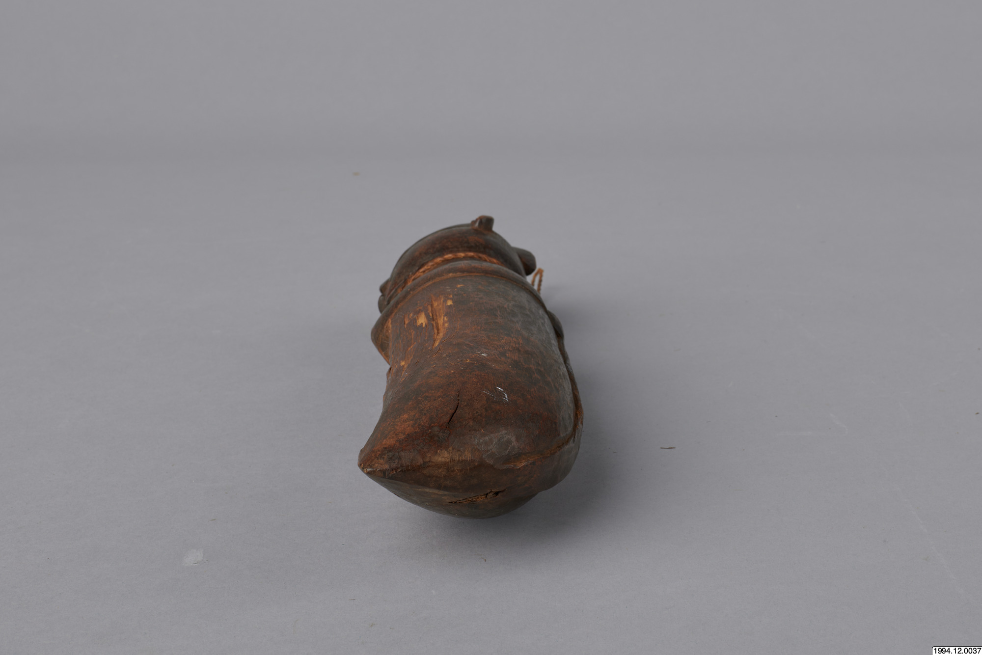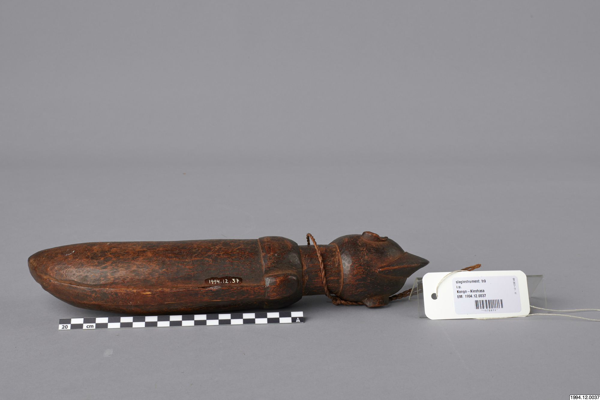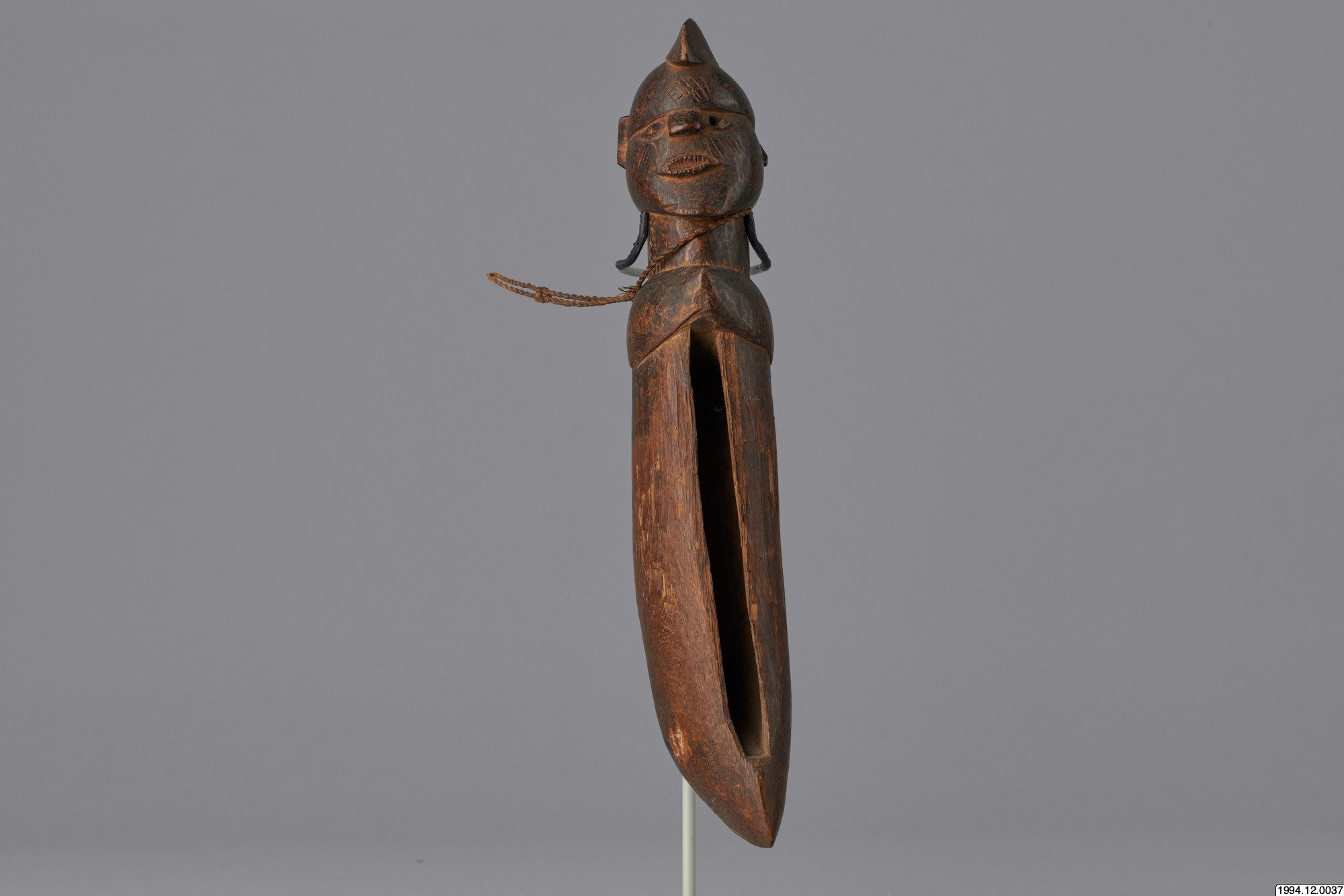 Slaginstrument. Handtaget är skulpterat i form av ett manshuvud. "NKONGI- taktinstrument. Trakteras med pinne".(Generalkatalogen)