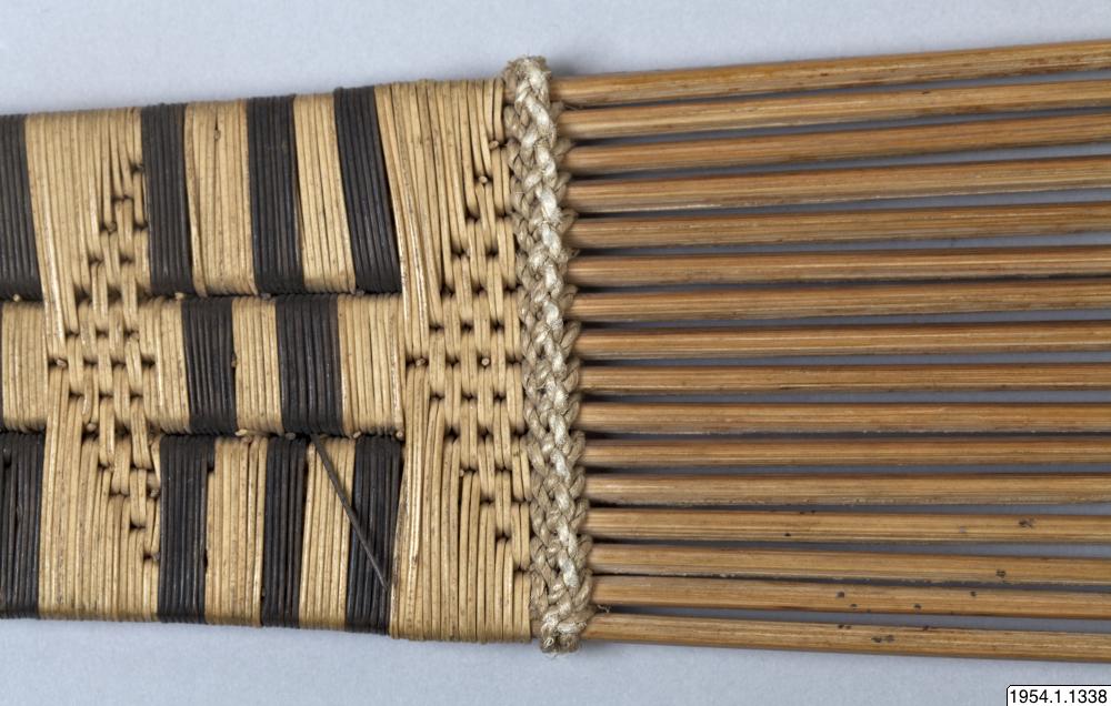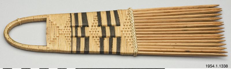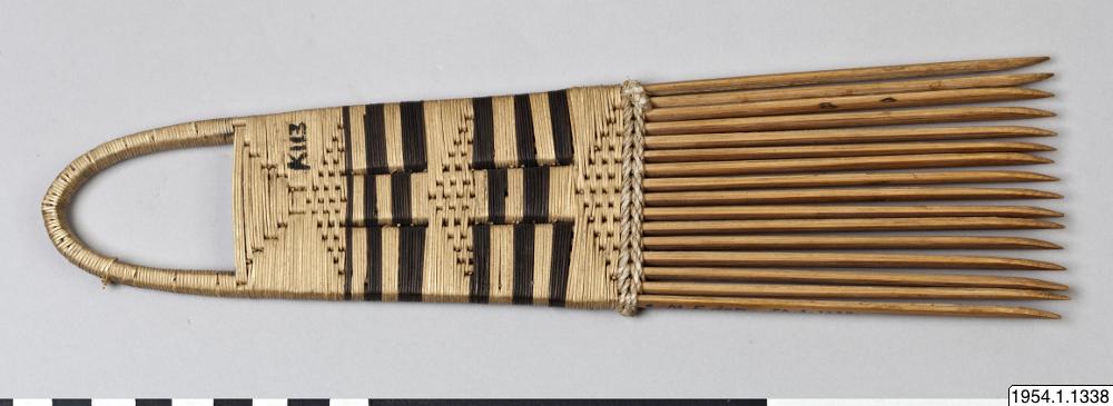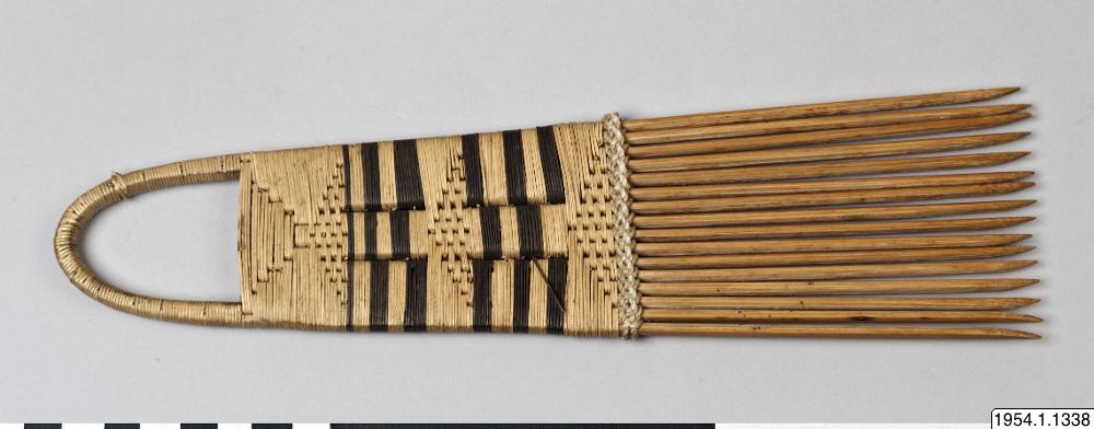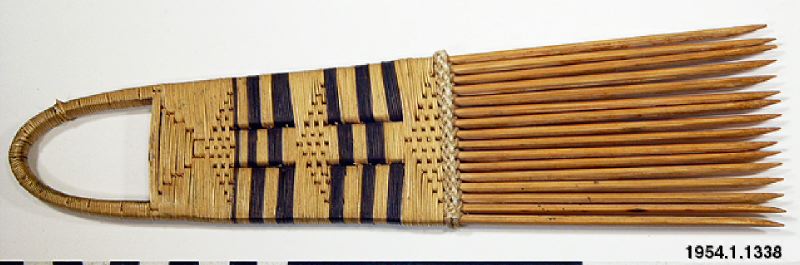 • Kam bestående av 16 avlånga stickor av ljust trä. Dessa har fogats samman på halva längden med hjälp av tunna växtfibertrådar i ljusa och mörka toner. Ihopfogningen är dekorativt utförd, mönster av olika slag framträder genom knutvariationerna. Upptill ett rundat handtag.