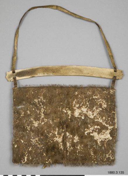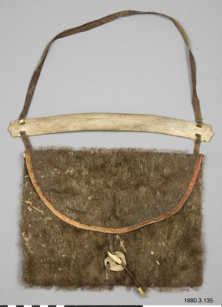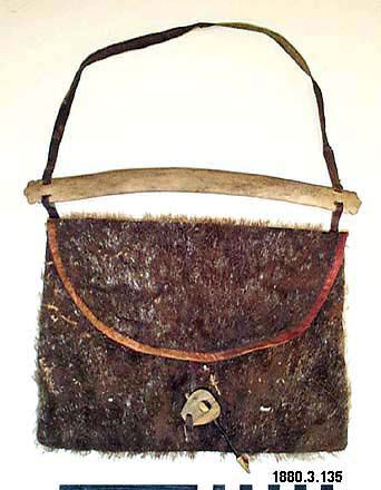 Jaktväska, s.k. ¿pökálak¿ enl katalog. Av grått sälskinn med rött bemålat skinn i remsa längs lockkant och vitt längs väsköppning. Över väskan är en hornpinne fastträdd i bärremmen av skinn, igenom dubbla hål i sidorna på pinnen. Knappar och ¿knapphål¿ av horn till locket.