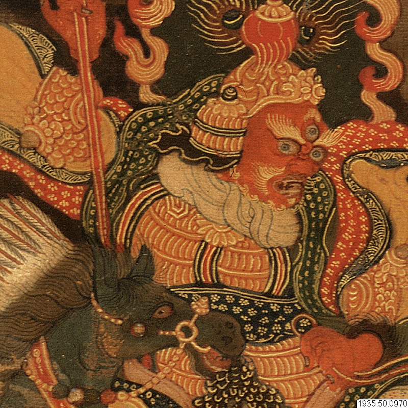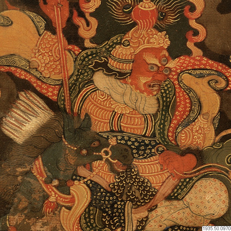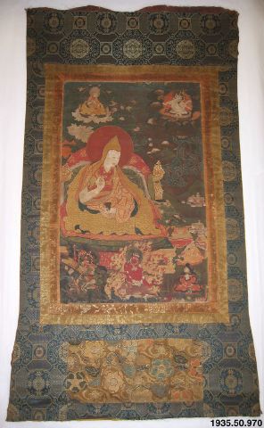 Bildrulle med gouachmåleri på bomullsväv med huvudmotiv av den tredje Dalailama. Se ¿Dalai Lamas and former incarnations of Avalokitesvara¿ Toni Schmid, thanka IX. Bård av mönstervävt siden i en sammansatt bindning (lampas?) runt måleriet - nätverk av blomster i blågrönt, gult, grönt och brunt. Rektangel av mönstervävt siden (broscherat inslag) fastsydd inuti nederdel av ytterbården - detta motiv av gula, bruna och blågröna färger har mer naturalistiska växtformer. Närmast måleriet två smalare mönstervävda bårder i orange resp gult siden, båda med inplockade mönster av guldtråd (guldförgyllda utskurna papperslan). Brunrosa grövre tukaftvävt sidenfoder på baksidan. Monteringsribba upptill och rundstav nertill är borttagna. [[Textil]]