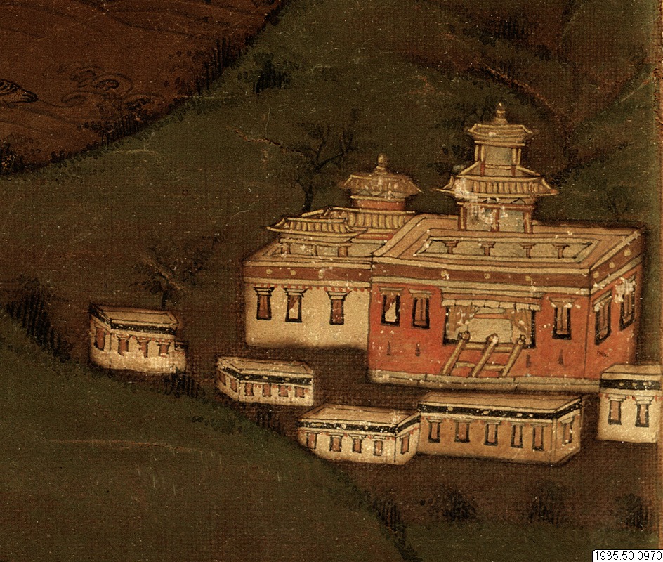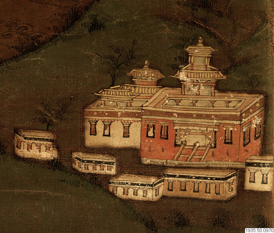 Bildrulle med gouachmåleri på bomullsväv med huvudmotiv av den tredje Dalailama. Se ¿Dalai Lamas and former incarnations of Avalokitesvara¿ Toni Schmid, thanka IX. Bård av mönstervävt siden i en sammansatt bindning (lampas?) runt måleriet - nätverk av blomster i blågrönt, gult, grönt och brunt. Rektangel av mönstervävt siden (broscherat inslag) fastsydd inuti nederdel av ytterbården - detta motiv ...