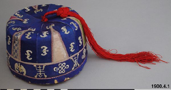 • Gossmössa av siden med broderade läderlappar i vitt på blå botten. Röd tofs. Kina Huvudprydnad, diademformigt av violett siden med svart sidenbård, brodera4. med vita läderlappar, skrivtecken, m.m. för kvinnor. Kina [ocr]