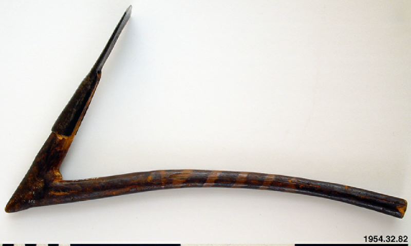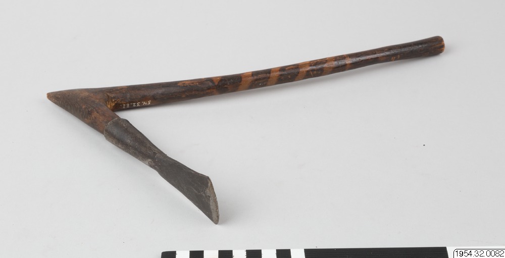 Yxa. För tillverkning av elfenbens- och/eller träföremål. Tvärplacerat järnblad med böjd egg. Skarpt vinkelböjt skaft av trä. Den längre delen av skaftet cirkelrund i genomskärning, något böjd och med målad dekor. Eggens längd 4,4 cm. Den längre delen av skaftet 35 cm i max. längd. (generalkatalogen)
