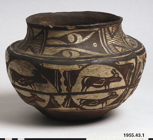 LerkärL, Yttersidan är täckt av ett vitaktigt färglager på vilket finns målad dekor i två mörkbruna nyanser. . Zufli Pueblo. New Mexico U.S.A. Höjd 20 cm.