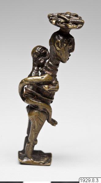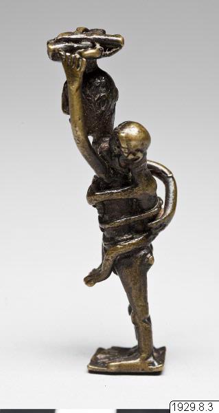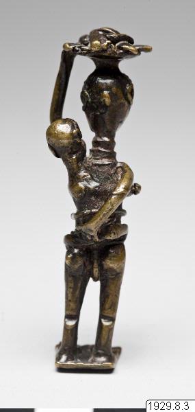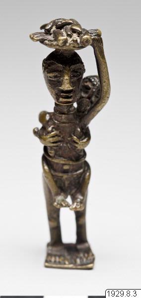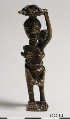 Guldvikt föreställande en kvinna stående med en korg på huvudet och ett barn på ryggen. Med vänster hand håller hon i korgen medan den högra är bakåtböjd och stödjer barnet på ryggen.