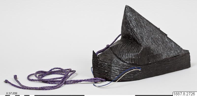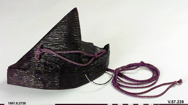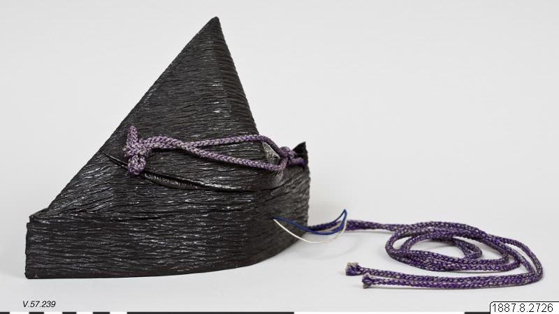 Huvudbonad för präst. Av pressat och svartlackerat papper. Hög spetsig form som går tillbaka på klassiska kinesiska förebilder. Violett silkessnodd. (generalkatalogen)