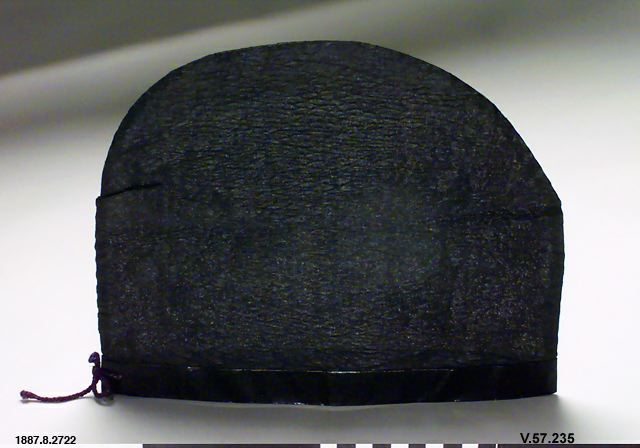 Huvudbonad av tunt svart tyg. Svart lackerad kant. Hör till dräkten V.57.226. dvs 1887.8.2714.