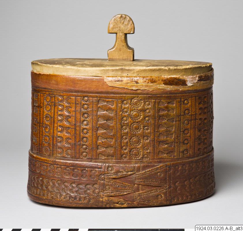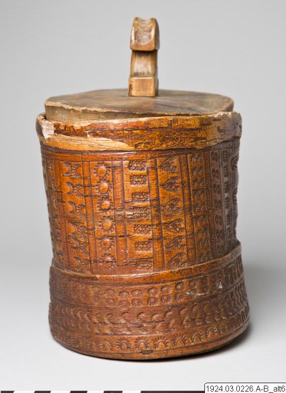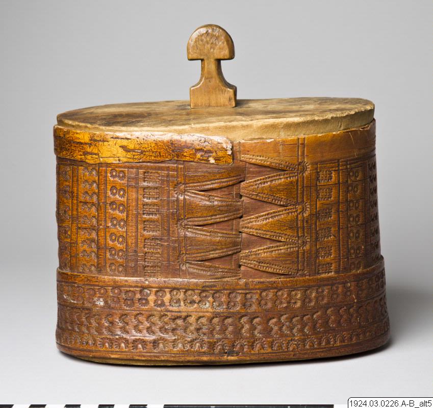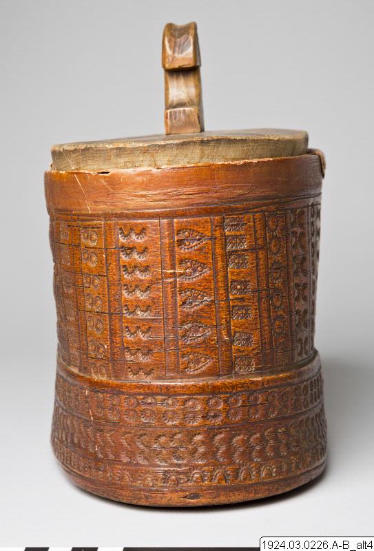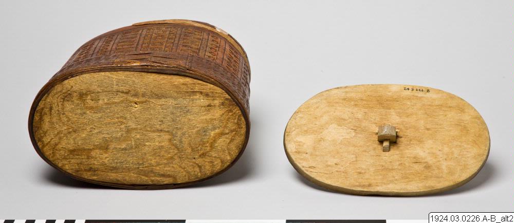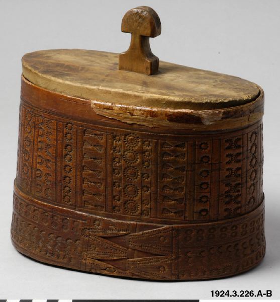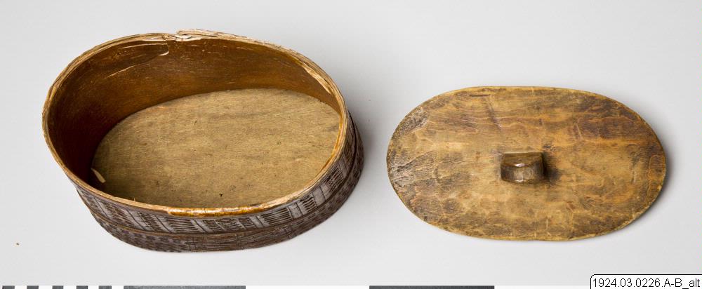 • Dosa av näver. Svepkärl av oval form - snusdosform. Yttersidan med riklig inpunsad dekor. Det ovala trälocket har en timglasformig tapp med halvcirkelformig spets i centrum.