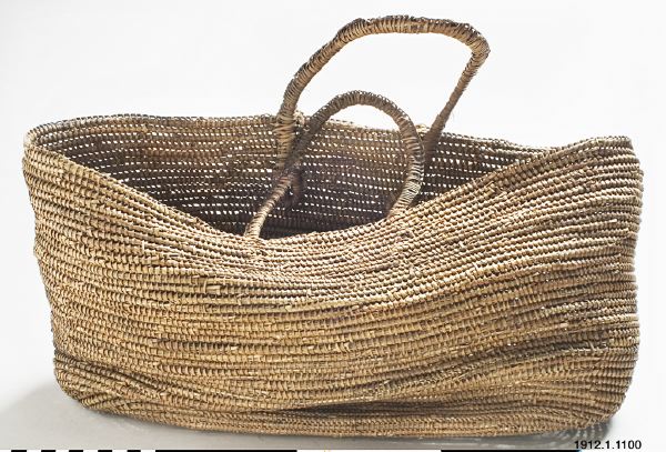 • Väskliknande korg, flätad av rottingliknande gräsart. Försedd med två handtag/bärremmar. Usprunget något osäkert kan vara ngn av Torres Strait öarna.