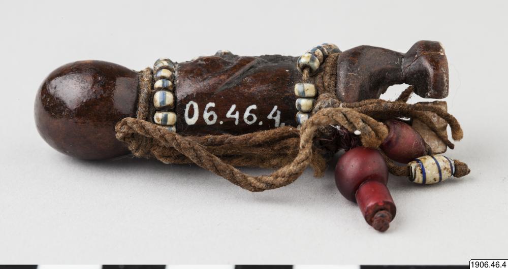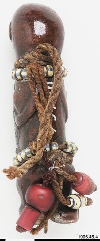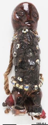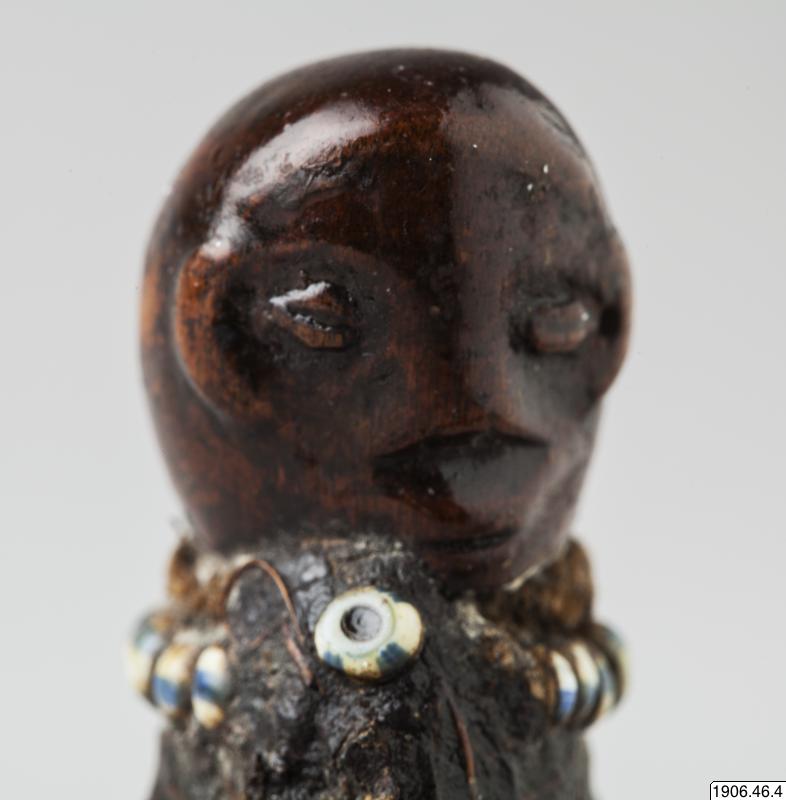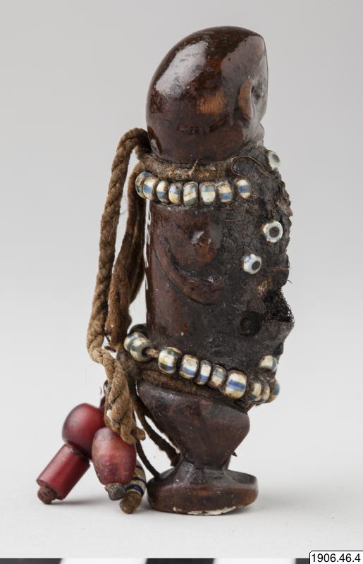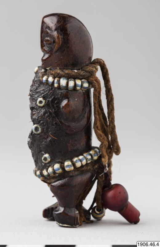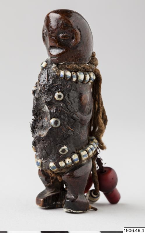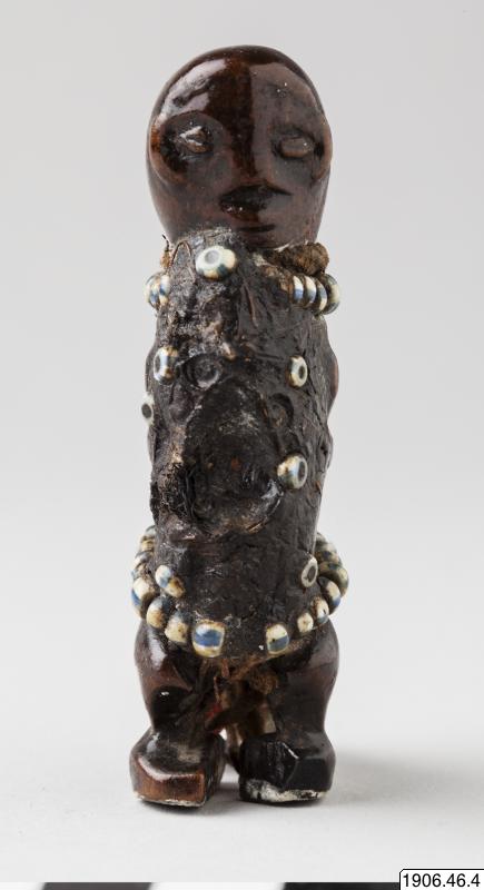 Fetisch, antropomorf skulptur med stor färgsymbolism. En kraftbärande bilongo-behållare över magen där en snäcka suttit, men fastnat och lämnat tomrum. Behållaren inramad av varsin rad vita pärlor med blå ränder uptill kring halsen och nertill kring bäckenet. Vita och röda pärlor i snören som svans. Missionär Johan Hammar skriver om tekiskulptur att dessa: "I förbigående nämnde vi biteki som föreställa människor. De göras av någon i träsnideri kunnig person och säljas till prästen såvitt han ej tillverkar dem själv. Man tror att i en teki bor någon avlidens ande och verkar. De invigas och helgas precis som minkisk och skola enligt Minludi vara mäktigare än dessa. Om dem berättar han: Då någon vill komma i besittning av en teki, ska han gå till en präst som har en sådan. Den bäres till den blivande prästens by och denna tittar teki i sätet under det han nämner vilkens persons ande som ska taga sin boning i den. Denne person ska de inom fyra dagar dödas i krig. Lyckas ej detta ska den utsedde falla ner från en hög palm eller störta i ett bråddjup. När han dött går hans ande in genom sätet på träfiguren som därigenom blir en mäktig fetisch. Härpå inviges teki på samma sätt som nkisi men så tillägger den nya ägaren: Mkwende, om teki fått detta namn, du ska inte ¿äta¿ andra än de friska och starka. Du ska vara i vår by och skydda oss och alltid lyda min röst. Men gå till andra byar och döda män och kvinnor ty unga och gamla smäda dig där och säga att du ej haft någon kraft. På det att teki må kunna gå till andra byar lämnas dörren till hans hus på glänt till natt och dag. Namn på biteko äro: makwende, nkondi, mbambi, zabakongo m.fl. En teki dödas då ägaren till den dött. Den lägges i en flod eller ett träsk eller på någon obebodd plats med dåligt rykte, vid en palm eller ett nsafu-träd för att där ruttna. Om någon äter av det trädets frukt dör han. På platser där inget gräs växer får ej teki läggas ty då ska det inte regna." (1907:143-145) För mer info om nkisi se 1906.46.0001