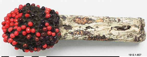 Behållare att förvara eldon i. Tillverkad av bambu eller bambuliknande gräs, där två "bamburör" har sammanbundits med växtfibrer och överdragits med ngt slags kitt och målats vitt. I botten är rören instuckna i en boll/klump av det ovan nämnda kitt eller gummi som smyckats med röda abrusfrön. Hylsan/behållaren gör att elddonen alltid är torra.