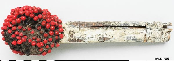 • Behållare att förvara eldon i. Tillverkad av bambu eller bambuliknande gräs, där två "bamburör" har sammanbundits med växtfibrer och överdragits med ngt slags kitt och målats vitt. I botten är rören instuckna i en boll/klump av det ovan nämnda kitt eller gummi som smyckats med röda abrusfrön. Hylsan/behållaren gör att elddonen alltid är torra.