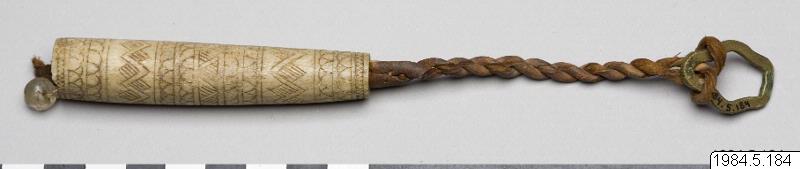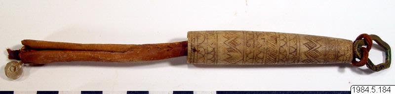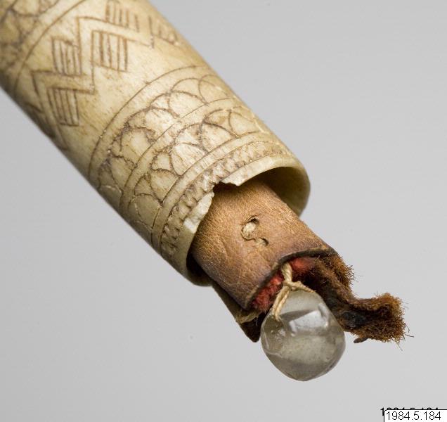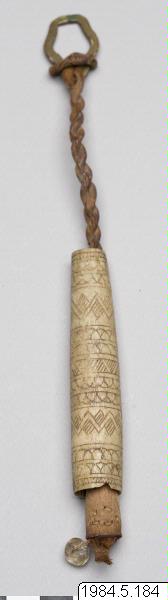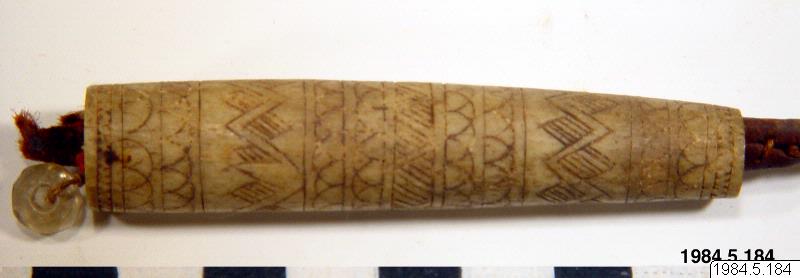 Nålhus av ben/horn, cylindrisk. Ristad, geometrisk dekor. Tvärs igenom löper en tvinnad lädersnodd som avslutas med en sölja av gul metall. I nederdelen av lädersnodden hänger en pärla av bergskristall.