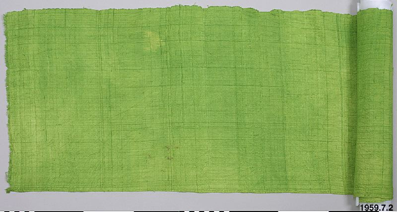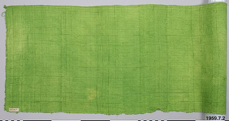 • Silkeväv (tussa?) i starkt grön färg, i tuskaftsbindning. En av stadkanterna finns kvar, dea andra långsidan har en handsydd fåll. Kortsidorna ligger öppna.