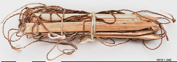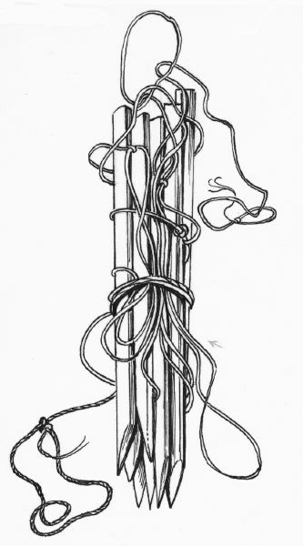• Korta träpinnar med krvade spetsar på vid deras ena ände. Smala snörer som tillbehör.