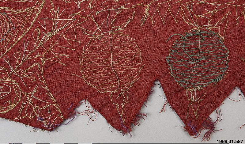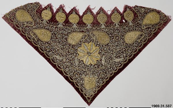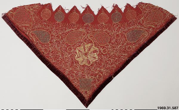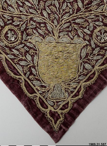 Metalltrådsbroderi på purpurfärgad sammet av silke och bomull. Broderiet utgör en hörnbit som är grovt urklipppt ur ett större föremål. Även några paljetter i metall ingår i broderiet. Ett rött bomullstyg ligger som stöd för broderiet. Objektet trialngelformat. Allt sytt för hand.Tagen ur samma föremål som fragment -69.31.588.